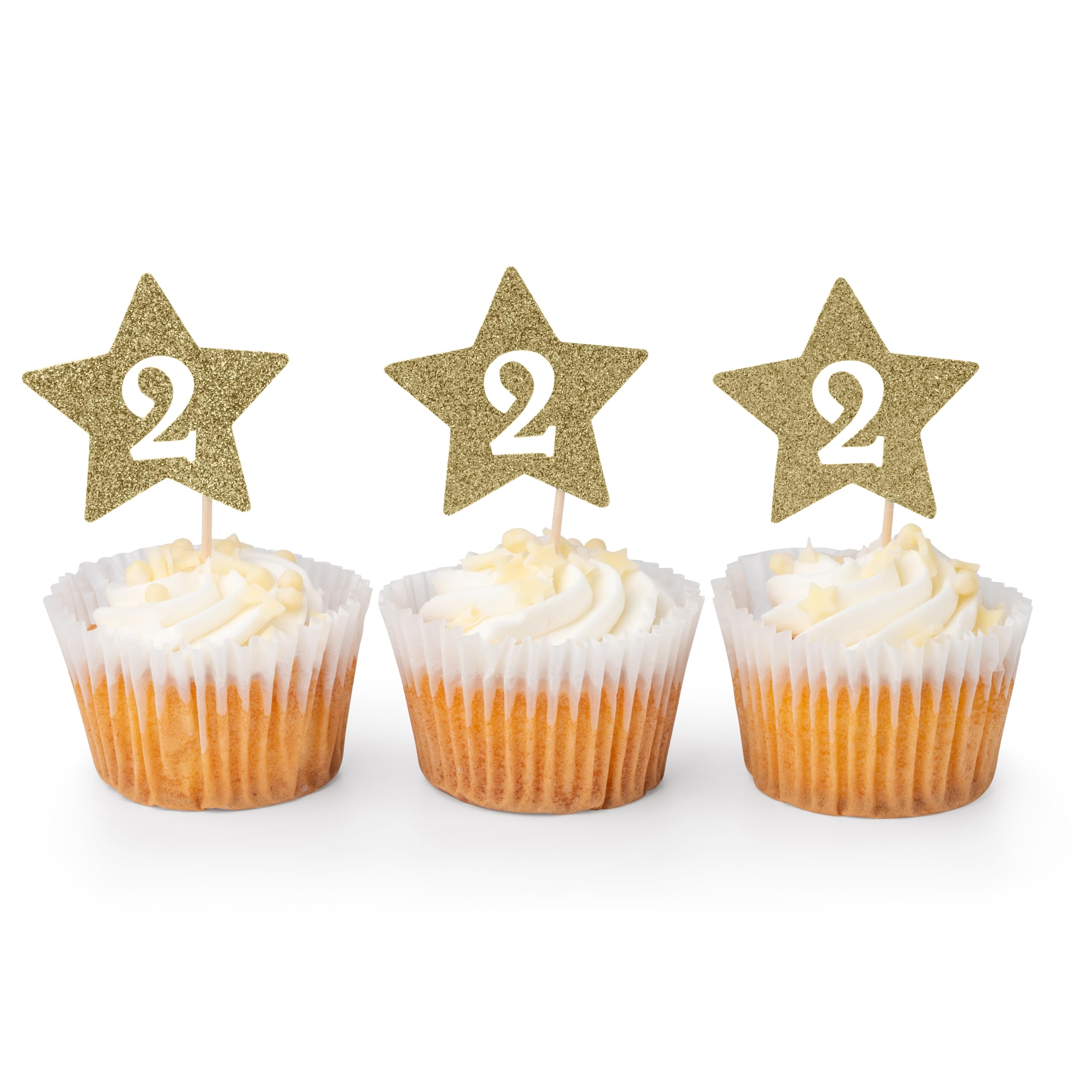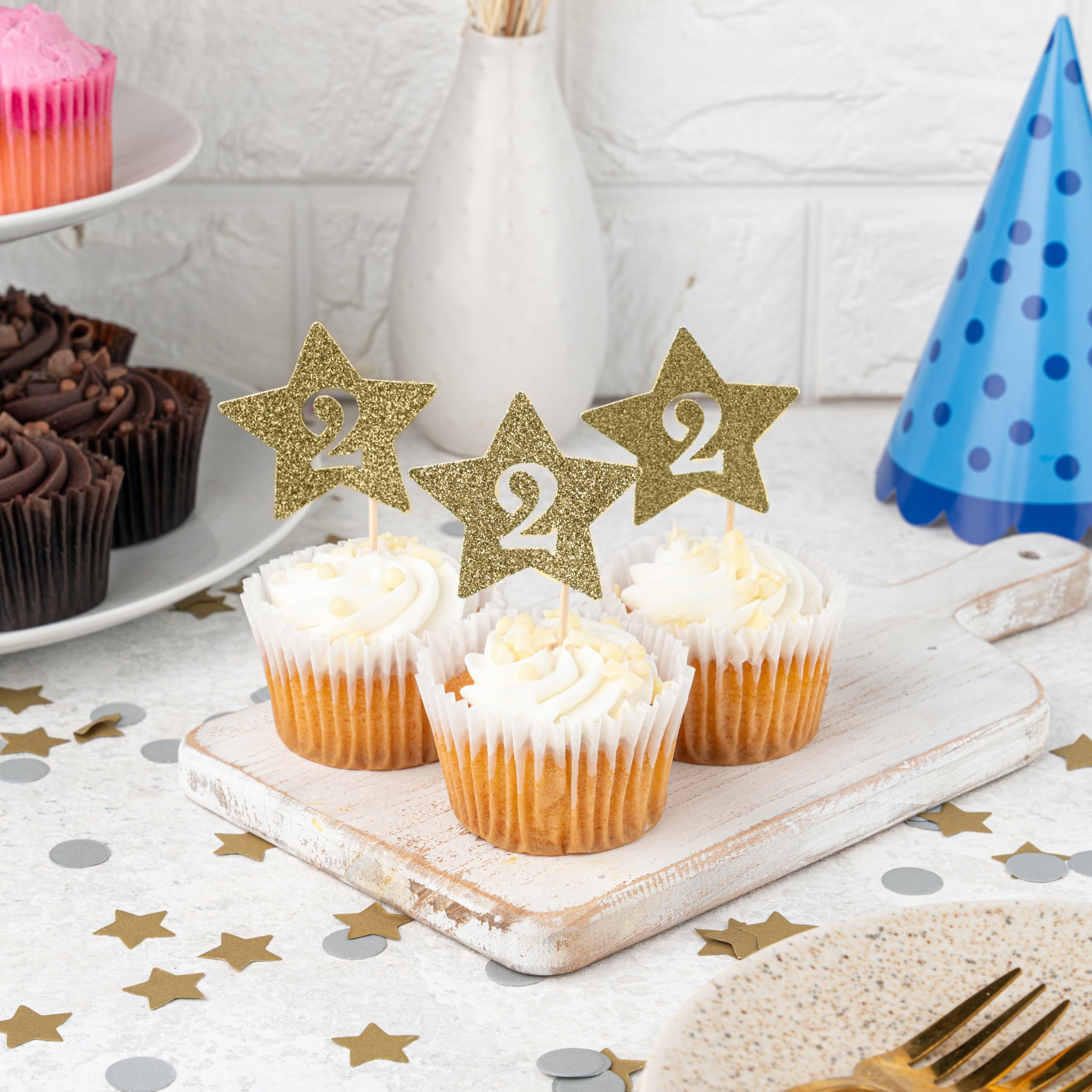 12 x Glitter 2nd Baby Birthday Cupcake Toppers – Festive Celebration Stars (Gold)