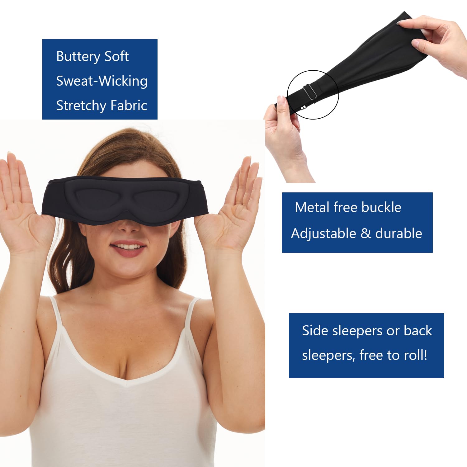 - Unique shaped eye cups & nose cutout - Never press against eyeballs, eyelashes or nose and yet create a perfect seal that blocks all light out no matter if you're a back, stomach or sensitive side-sleeper