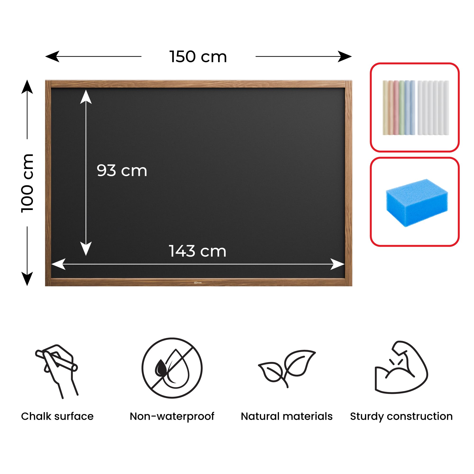 ALLboards Chalkboard with Varnished Wooden Frame 150x100cm, Large Chalk Board, Blackboard