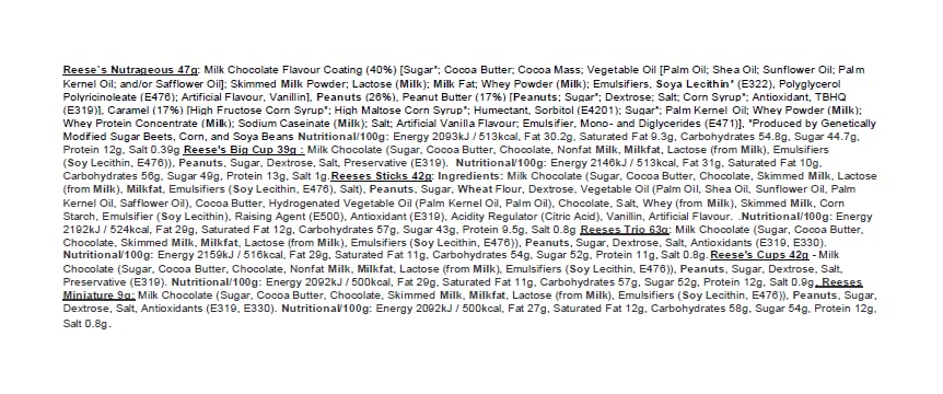 - PEANUT BUTTER AND CHOCOLATE Delicious Peanut Butter items included. Peanut Butter cups, pieces nut bar sticks