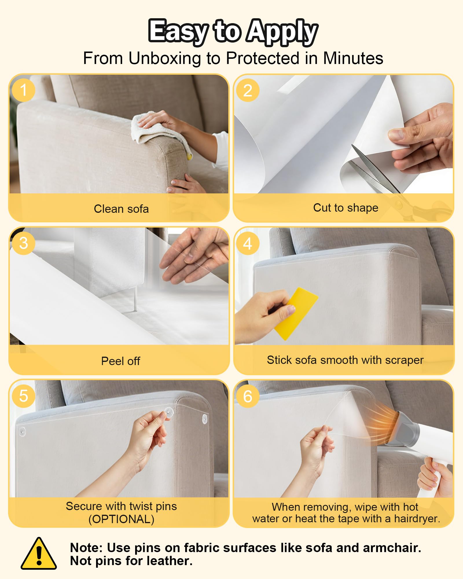 • COMPLETE & EASY INSTALLATION: Your all-in-one solution arrives ready to use! The generous 30cm x 500cm large roll can be easily cut to any size. The included scraper ensures a smooth, bubble-free application, while the 30 pins offer extra reinforcement for Fabric Sofa, Do not use pins on leather!!!