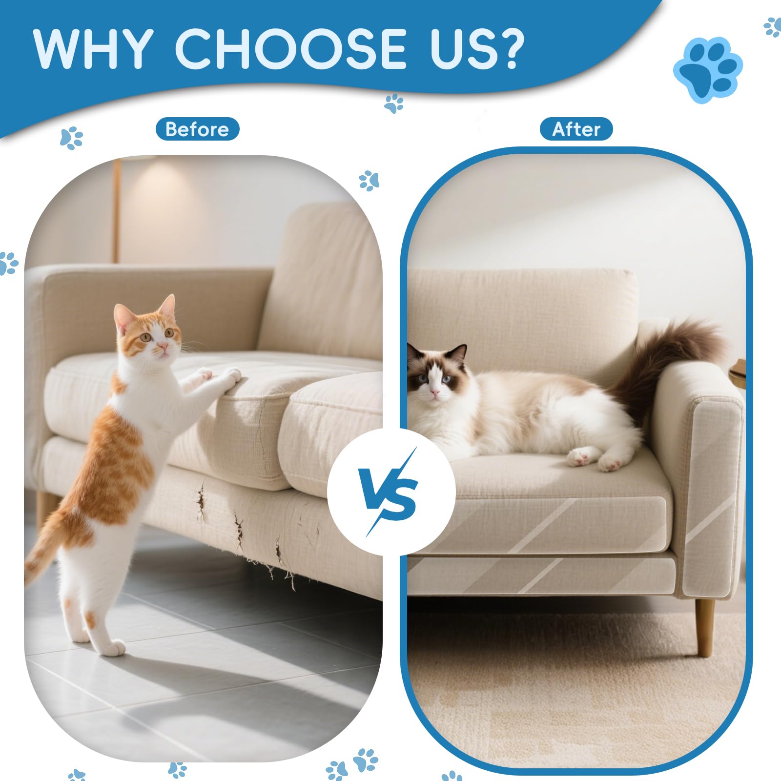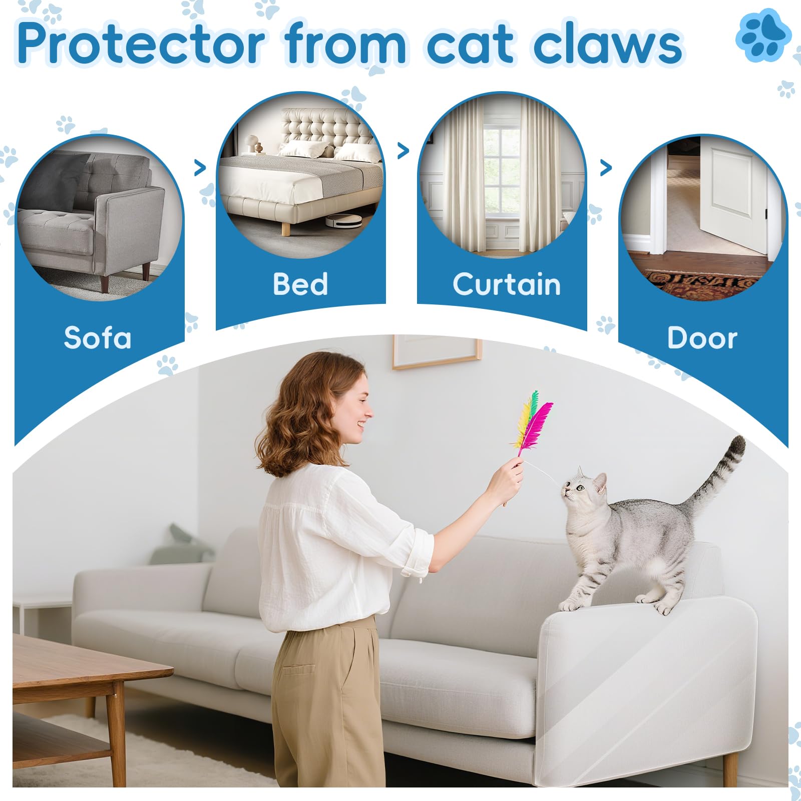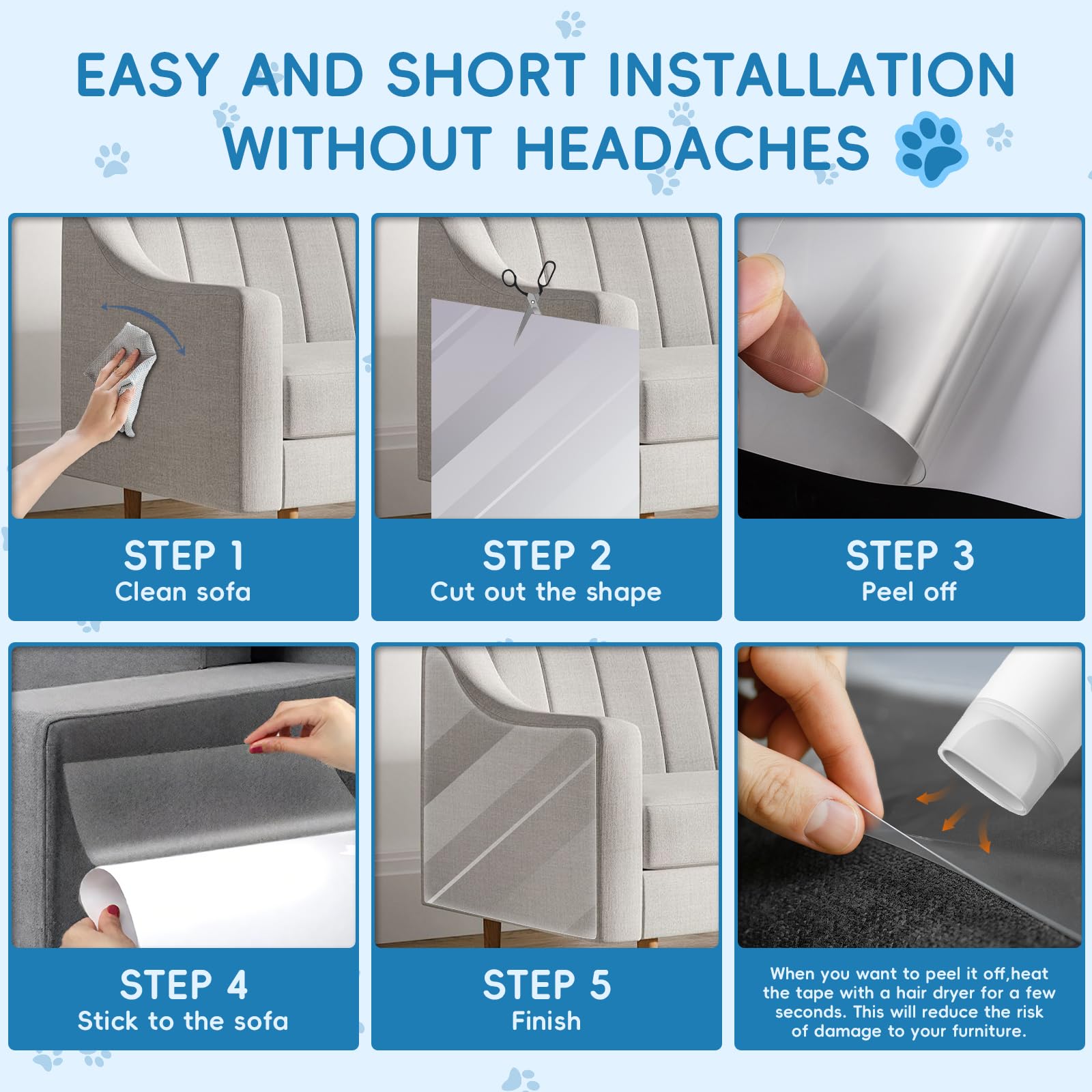 • [No Residue] Our cat furniture protector film can adheres firmly to cotton, polyester, wood, tiles, and more, and is especially suitable for fabric sofas. It can be cleanly peeled off without leaving any sticky residue or causing surface damage. (not suitable for leather or faux leather)