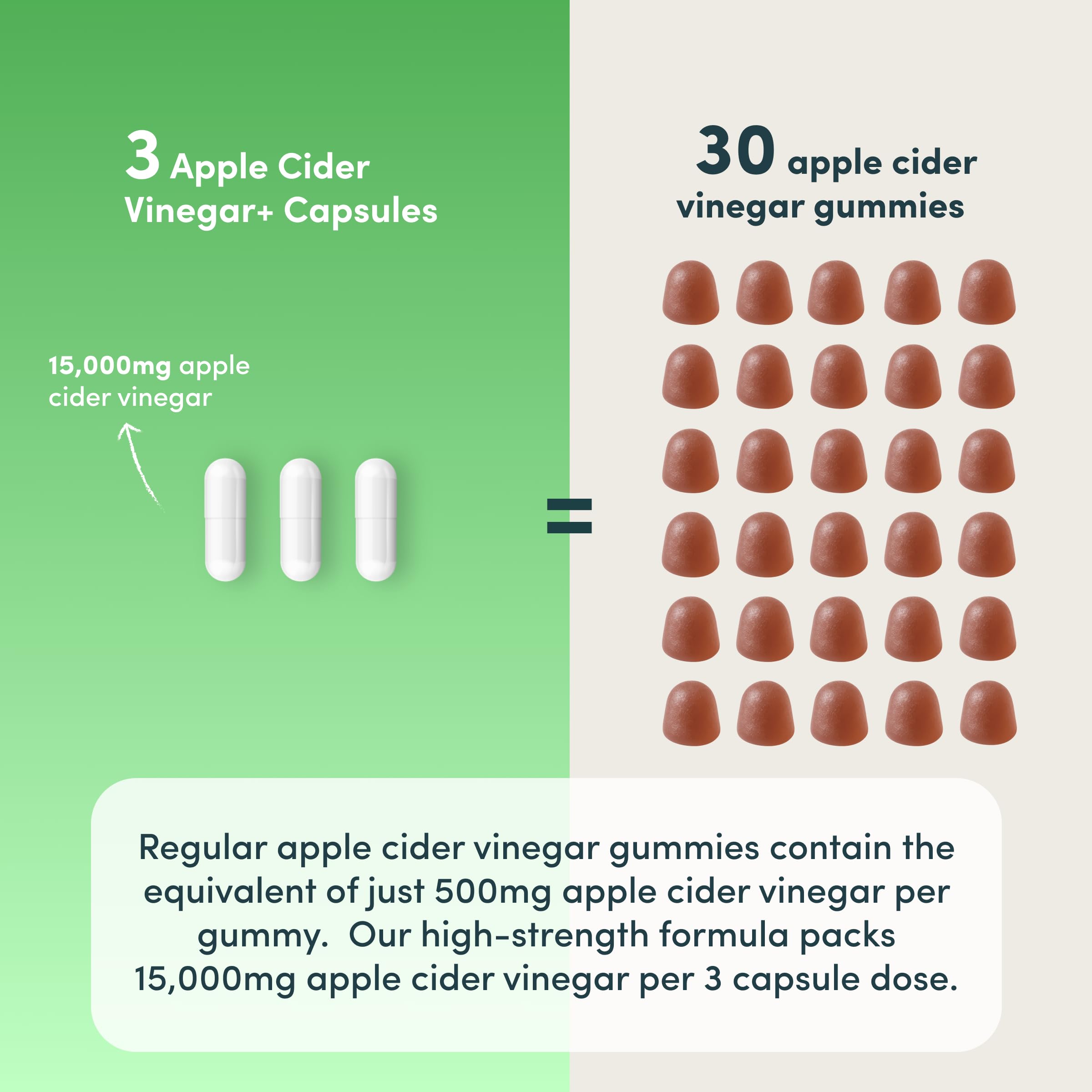 - Why Choose Nutrition Geeks Apple Cider Vinegar Capsules: Get 90 vegan capsules (30-day supply) of high-strength apple cider vinegar, providing the equivalent of 15,000mg ACV per serving. Our formula is teeth-friendly and also up to 10X stronger than other formats like apple cider vinegar gummies