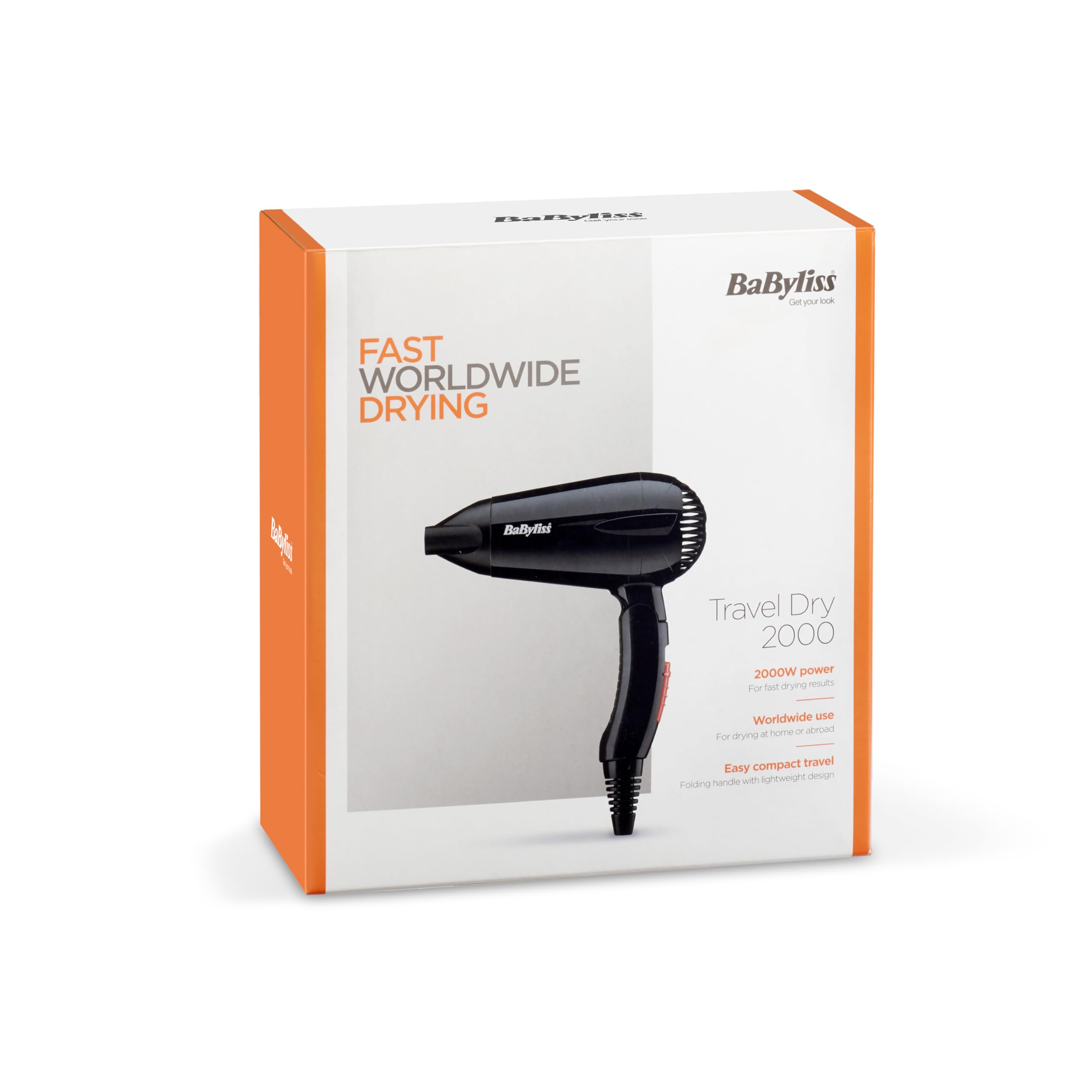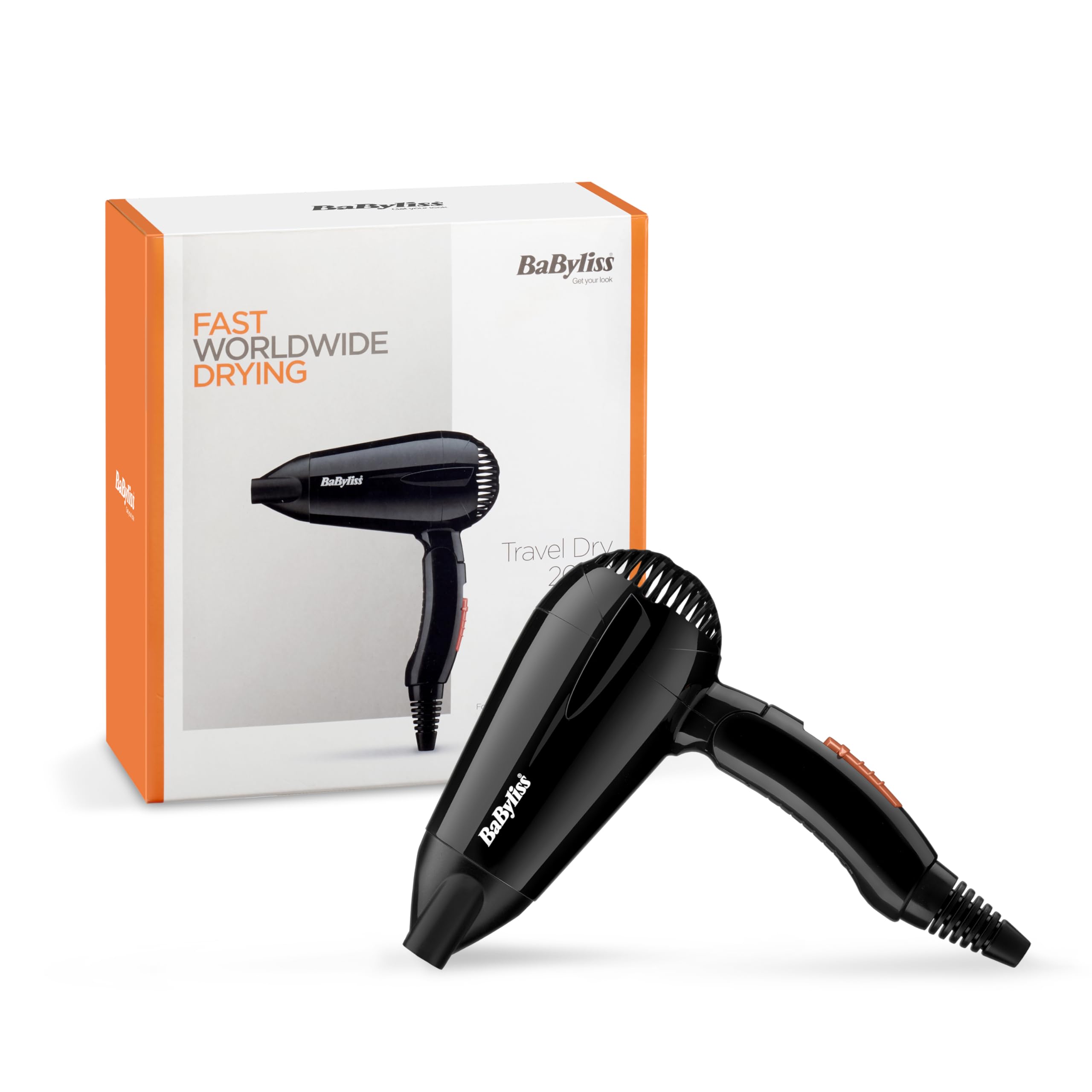 BaByliss Travel Folding Hair Dryer - Lightweight and Powerful 2000W Blow Dryer, Dual Voltage, Worldwide Use, 2 Heat/Speed Settings, Black/Orange, 5334U