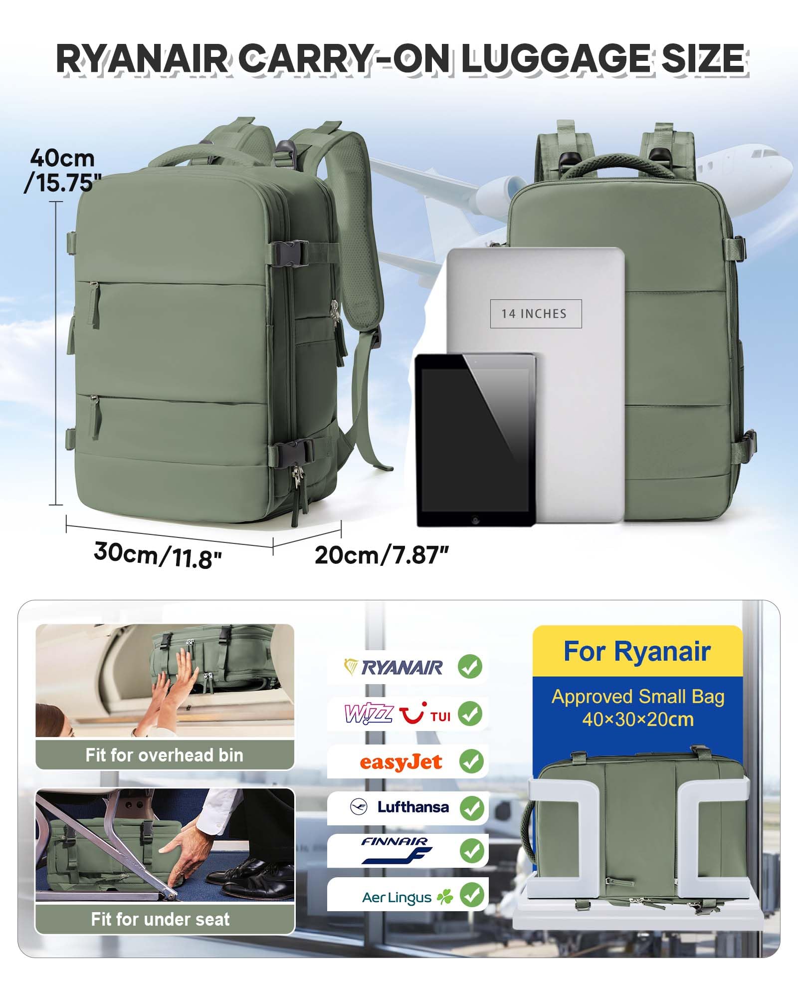 BJLFS Vacuum Backpack Travel Bag With Pump New Ryanair Cabin Bags 40x30x20 Underseat Carry On Baggage with Compression System For Flights Waterproof Laptop Backpack With USB Port and Shoe Compartment