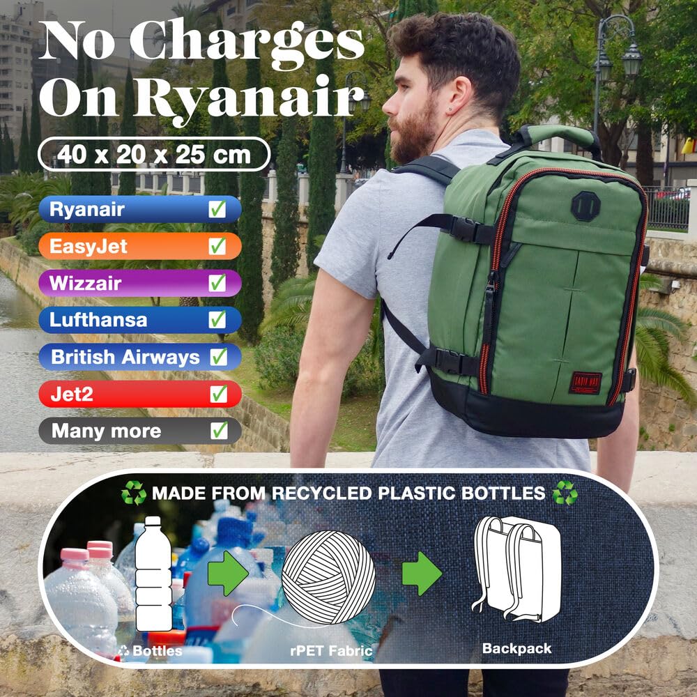- Ryanair hand baggage, 40 x 20 x 25 cm. Measuring 40 x 20 x 25 cm, the Metz Stowaway is the perfect size for Ryanair’s hand baggage allowance. With a volume of 20 litres and a weight of only 500 grams, the Metz Stowaway backpack is an ideal travel companion for Ryanair flights and many other airlines.
