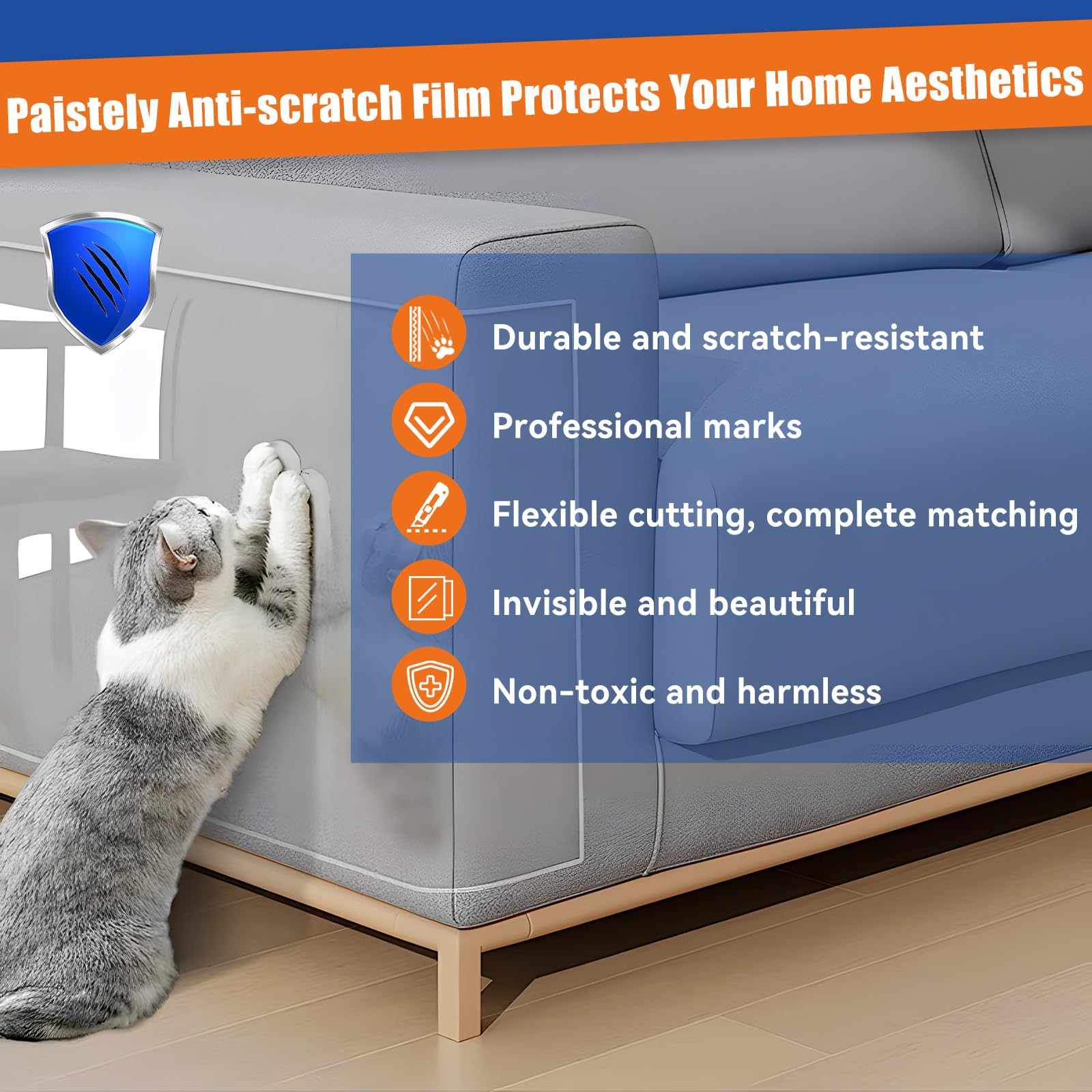 - Removal without traces: Paistely cat sofa protector uses professional high-viscosity traceless glue technology to ensure that the protective film is firmly adhered to the surface of the furniture, and no glue stains are left when it is removed. Traditional cat carpet protector often leaves adhesive residue when it is torn off, while our anti cat scratch furniture protector can achieve zero residue and zero damage when it is removed, which is both scratch-resistant and material-protecting, killing two birds with one stone