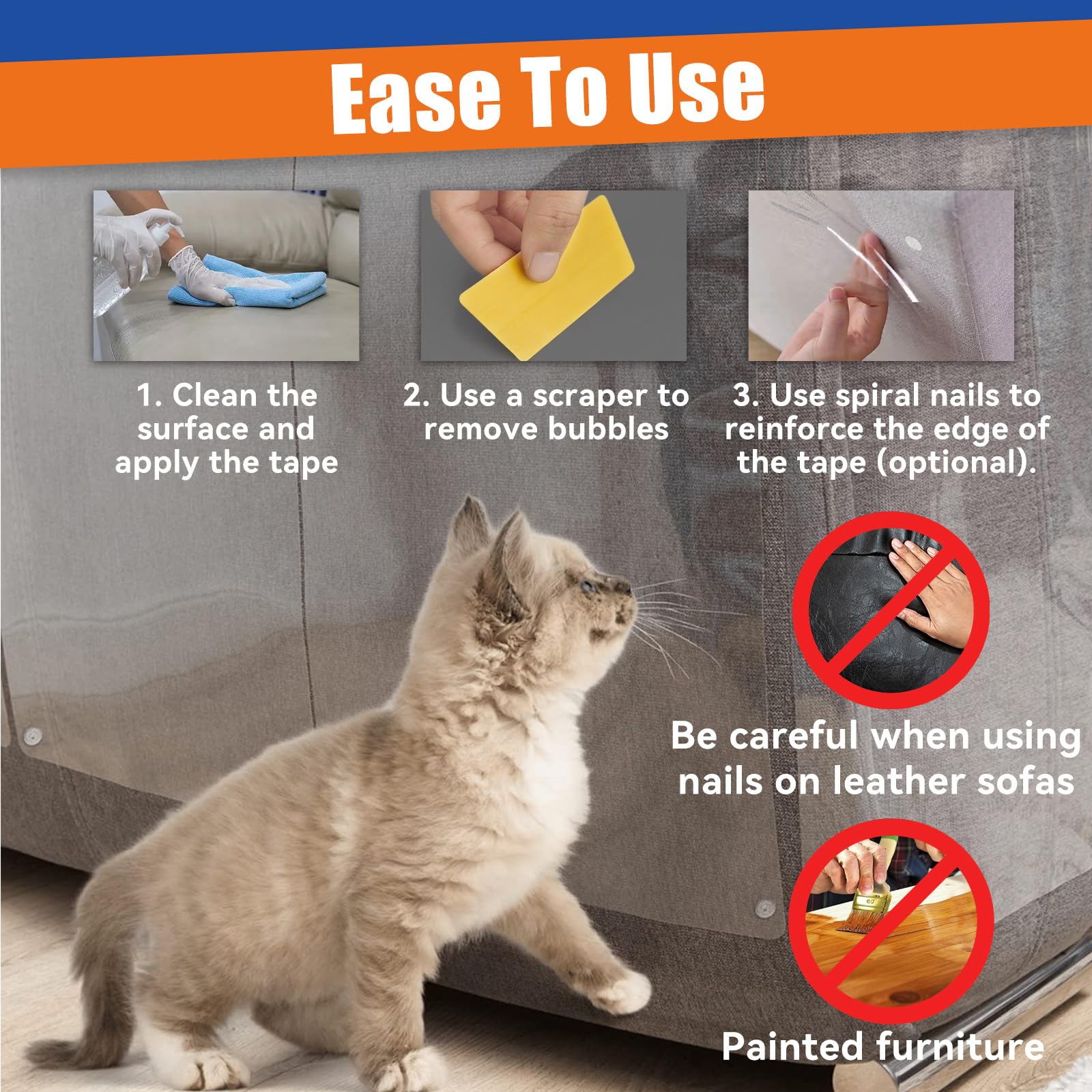 - Flexible cutting and complete matching: Paistely sofa cat scratch protector can be cut freely and fits perfectly in various areas. Just tear off the protective paper, align the position and press to firmly stick cat scratch protector. Our Furniture protector from cats comes with a scraper and spiral nails, and the scraper makes the cat anti scratch tape stick more smoothly. The spiral-designed fixing nails can be easily rotated by hand to fix cat anti scratch tape to prevent pets from scratching and falling off