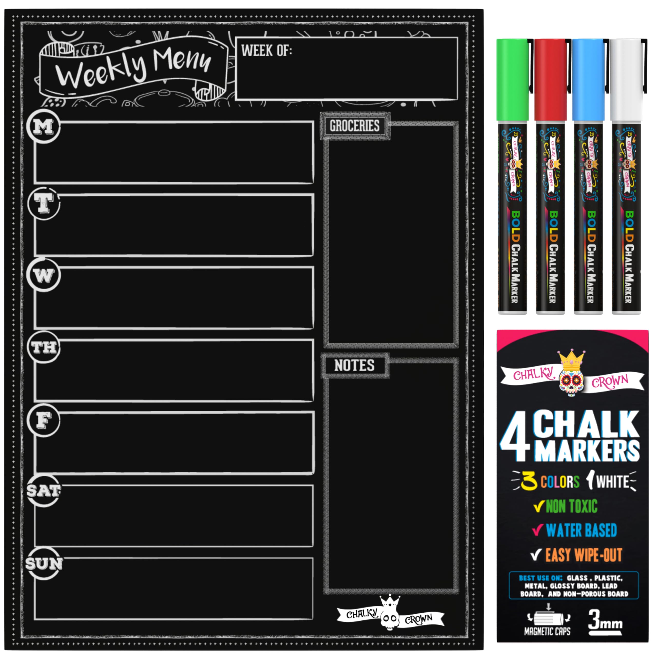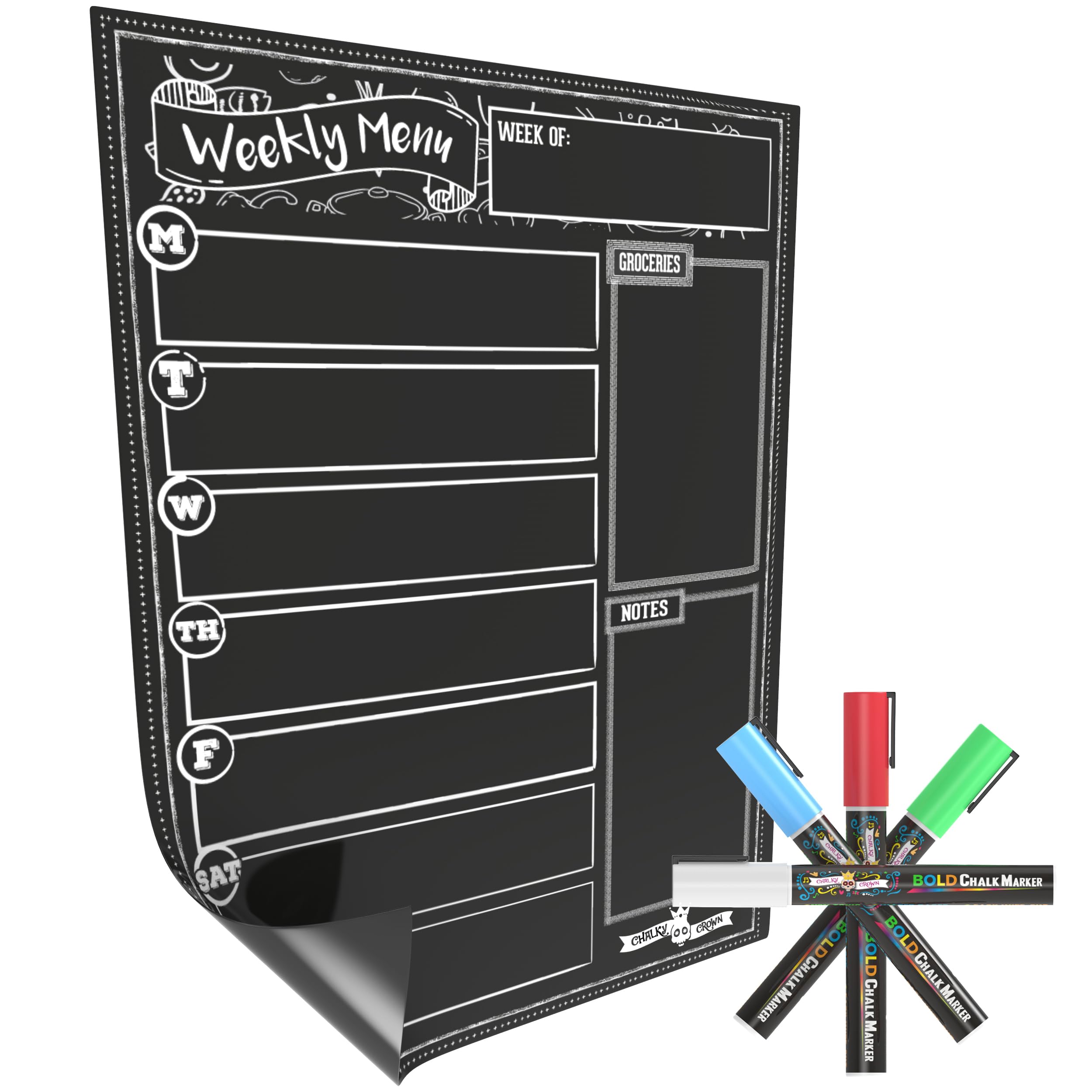 Chalky Crown - Meal Planner Board - Magnetic Dry Erase Menu Board for Fridge Includes 4 Liquid Chalk Markers - Weekly Meal Planner - Blackboard, Grocery List for Kitchen Refrigerator - Black