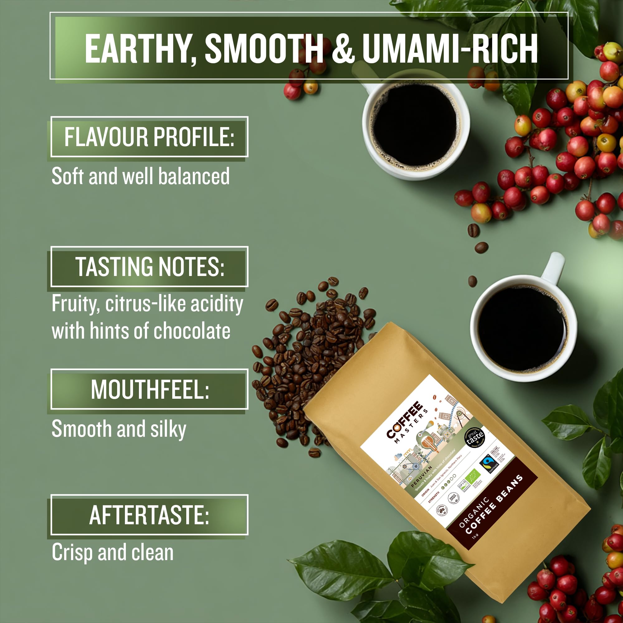 - 100% Organic Arabica Coffee Beans, Soft And Well-Balanced - Coffee Masters Peruvian Coffee Beans are soft and well balanced with a gentle, citrus-like acidity, which is complimented by a delicate sweetness and smooth, silky body. The after taste is crisp and clean.