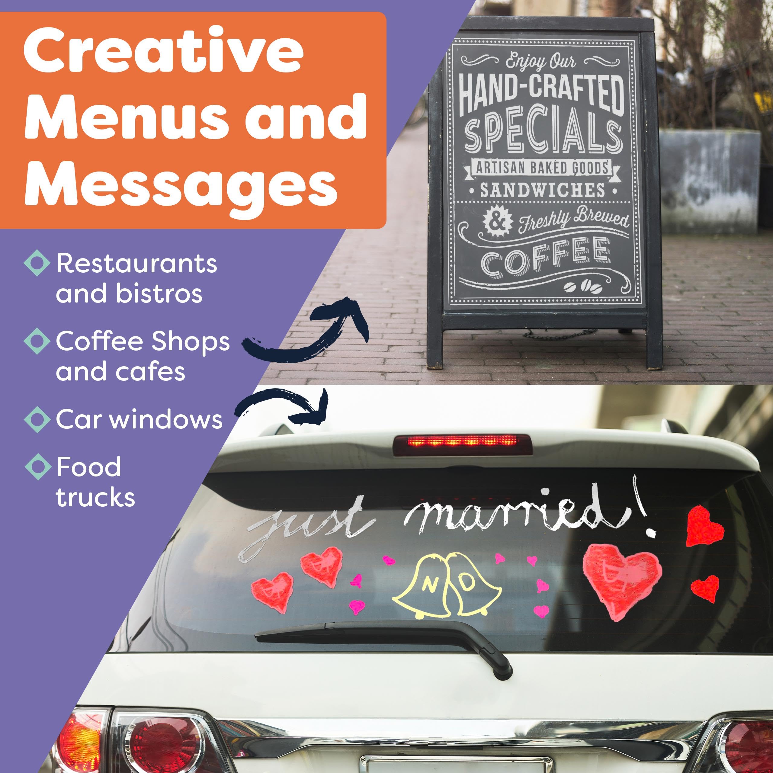 - VERSATILE: Ideal for decorating any window, bistro board, or even back-to-school sign, these window markers not only work on chalkboards, but also glass, ceramic, whiteboards, and more!
