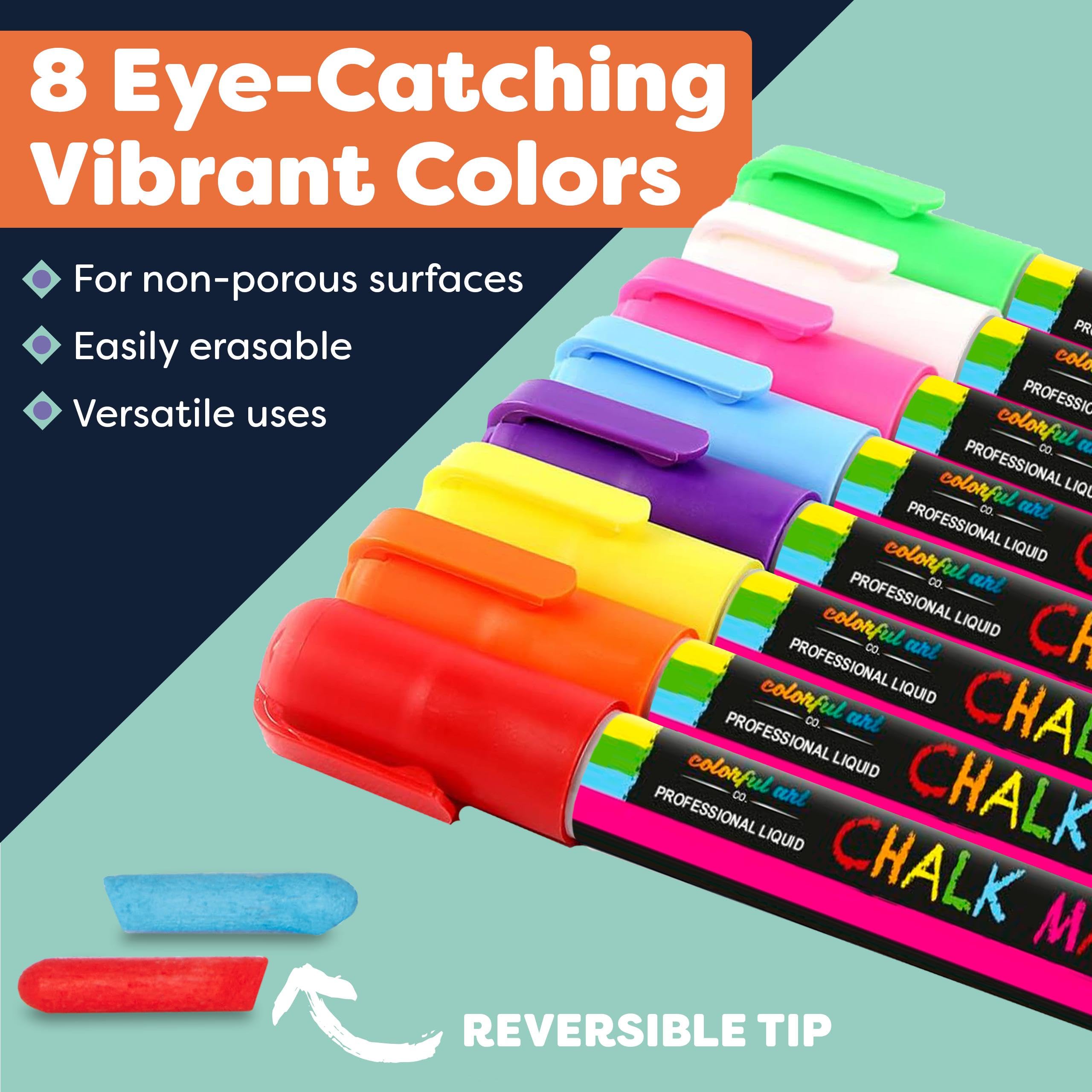 Colorful Art Co. Liquid Chalk Pens - Set of 8 Neon Colors - Washable Chalkboard Markers for School Blackboard, Menu Board, Mirror, Ceramics, Car Window Glass, Easy to Erase