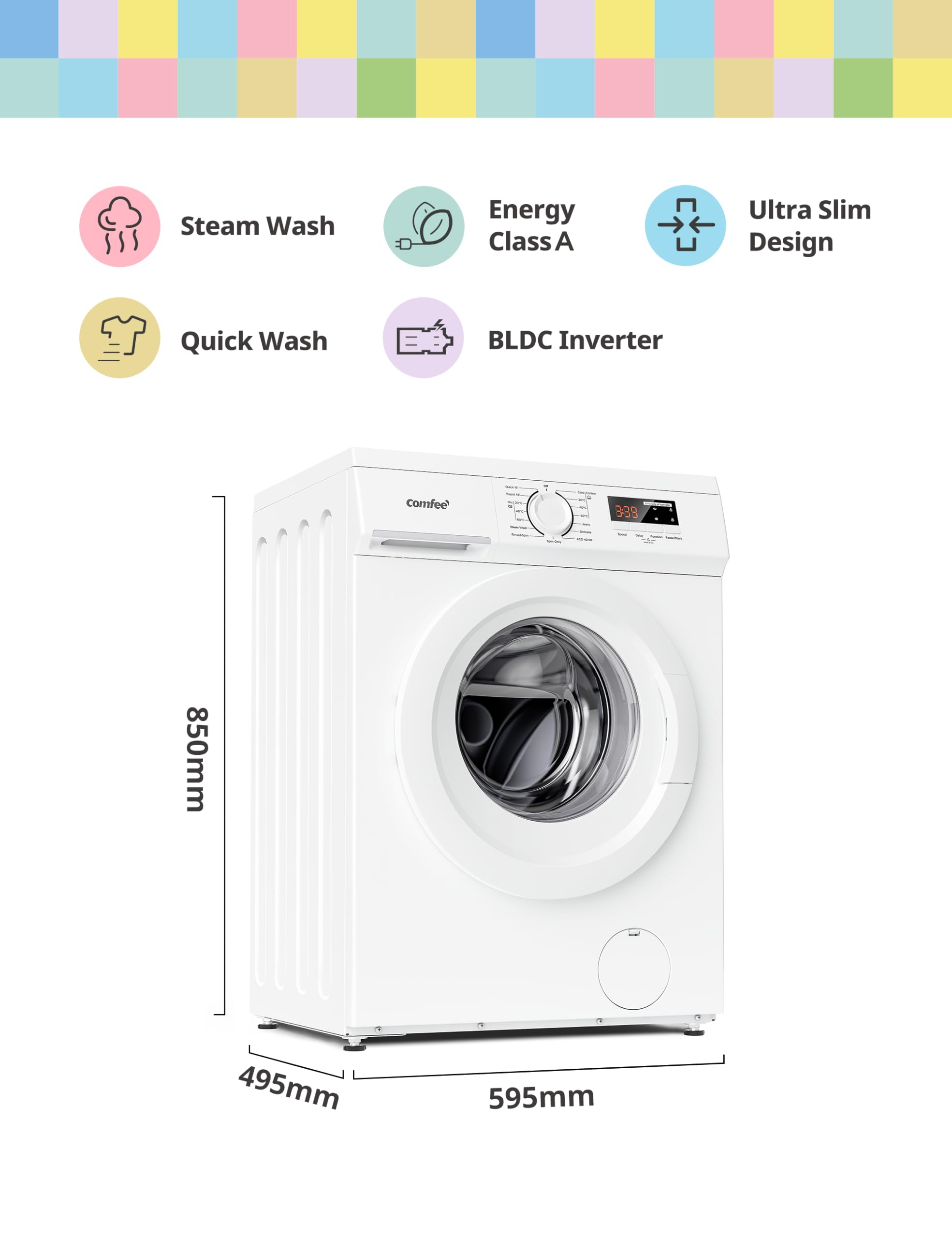 COMFEE' Freestanding Washing Machine,9KG Load,1400RPM,Steam Wash,Slim Design,Quick Wash,BLDC Durable Inverter Motor,White-CFE12EW90/W