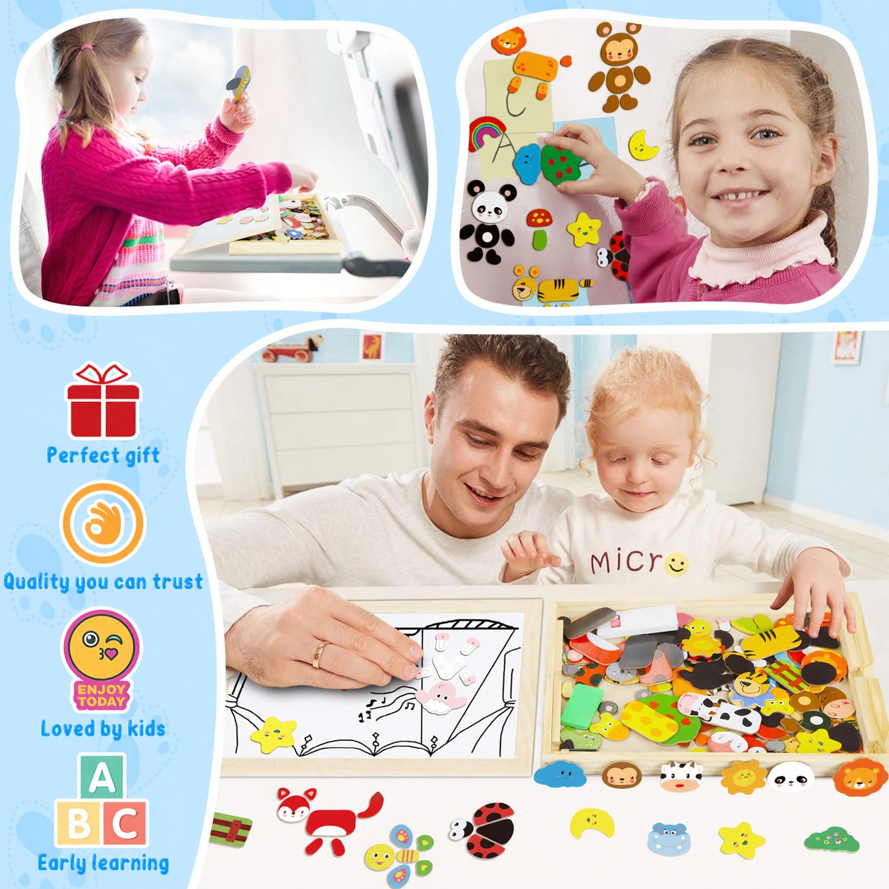 - 【Multi-Functional-Removable Board】Unlike other puzzles, our cute wooden magnetic puzzle has a big, stable, smooth board. It is a multifunctional magnetic double multi-functional sketchpad, besides can puzzle, also can be used as a drawing board, which is aim to promote children for understanding to The World of Cute Animals Pets, People, Plant, Color, Shapes, and Patterns.