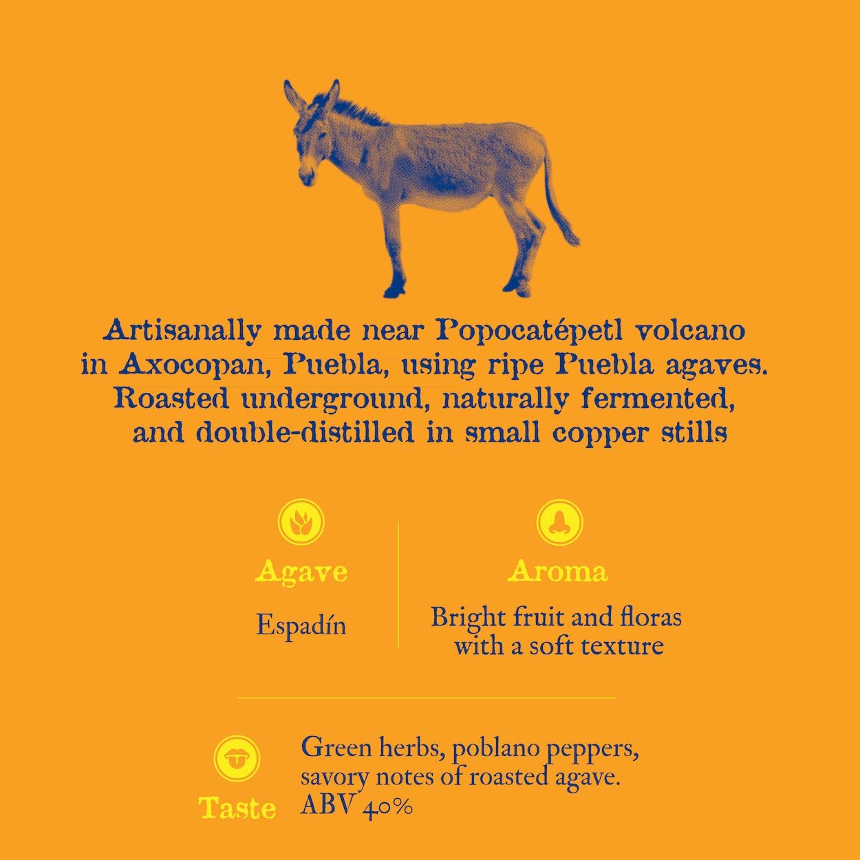 - Ripe agaves from Puebla are roasted underground, naturally fermented and twice distilled in small copper stills
