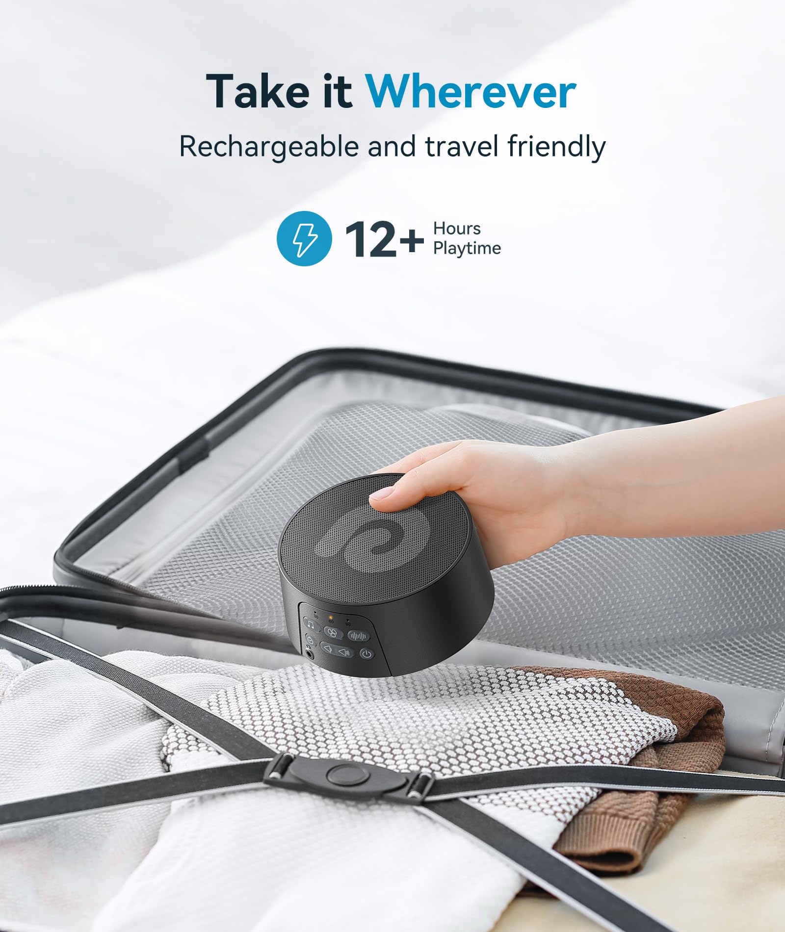 - ULTRA PORTABLE, PERFECT TRAVEL BUDDY - Don't let your sleep routine be disrupted while traveling. Our wireless white noise machine packs a rechargeable 1200mAh battery for 12 hours of continuous use on a single charge. Plus, it comes with a USB cable for easy charging on electrical outlets. Take this ultra-portable, travel-friendly sound machine with you wherever you go.