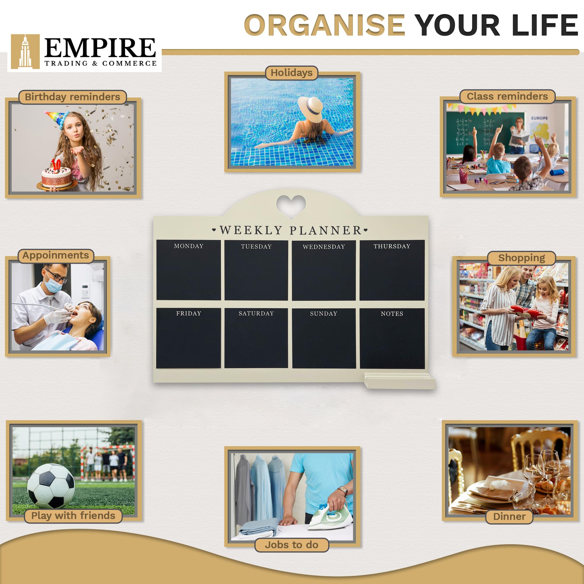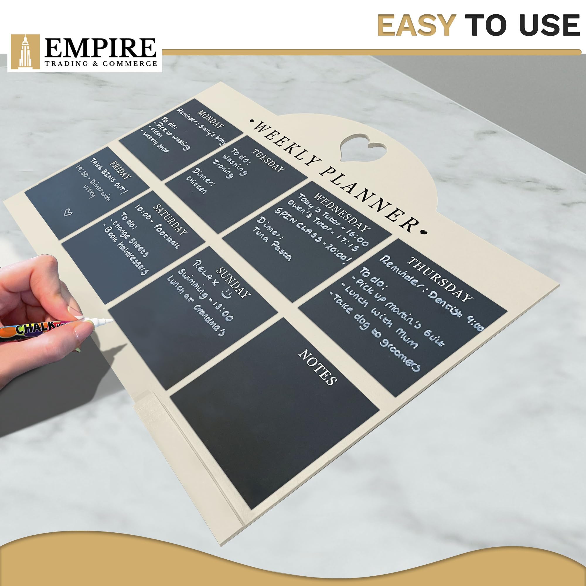 - MULTIFUNCTIONAL VERSATILE CALENDAR: The Empire weekly planner blackboard makes it simple to plan, schedule, and organise your daily activities, jobs, and business objectives. The screws and the hanging rope are included in the packing, this monthly planner chalkboard can be mounted on the wall of your kitchen, schools and offices