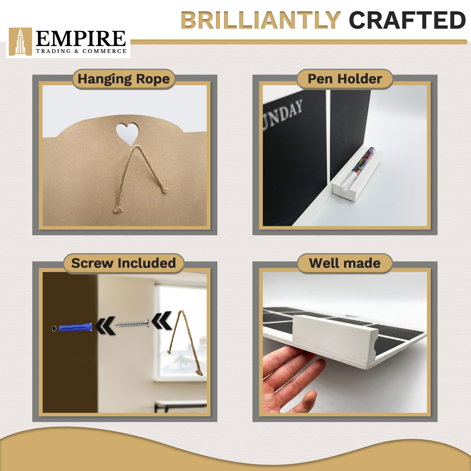 - MULTIFUNCTIONAL VERSATILE CALENDAR: The Empire weekly planner blackboard makes it simple to plan, schedule, and organise your daily activities, jobs, and business objectives. The screws and the hanging rope are included in the packing, this monthly planner chalkboard can be mounted on the wall of your kitchen, schools and offices