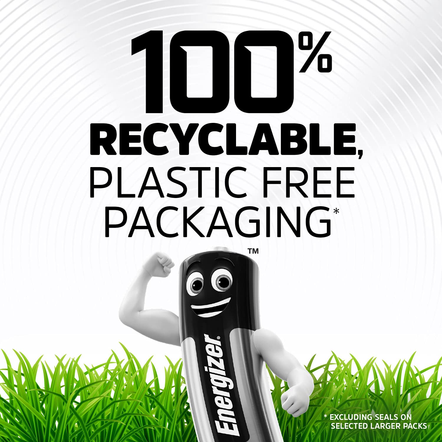 - Plastic-Free & Recyclable Packaging – 100% recyclable, plastic-free** packaging. Each battery includes up to 10% recycled steel—part of Energizer’s commitment to sustainability.