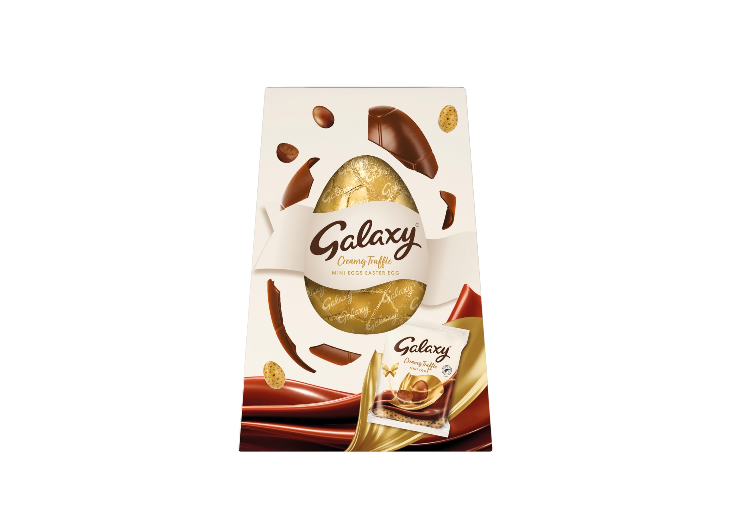 - A Galaxy hollow milk chocolate Easter egg with one 74g pack of Galaxy Milk Chocolate Creamy Truffle mini eggs. Total weight 194g. Suitable for vegetarians.