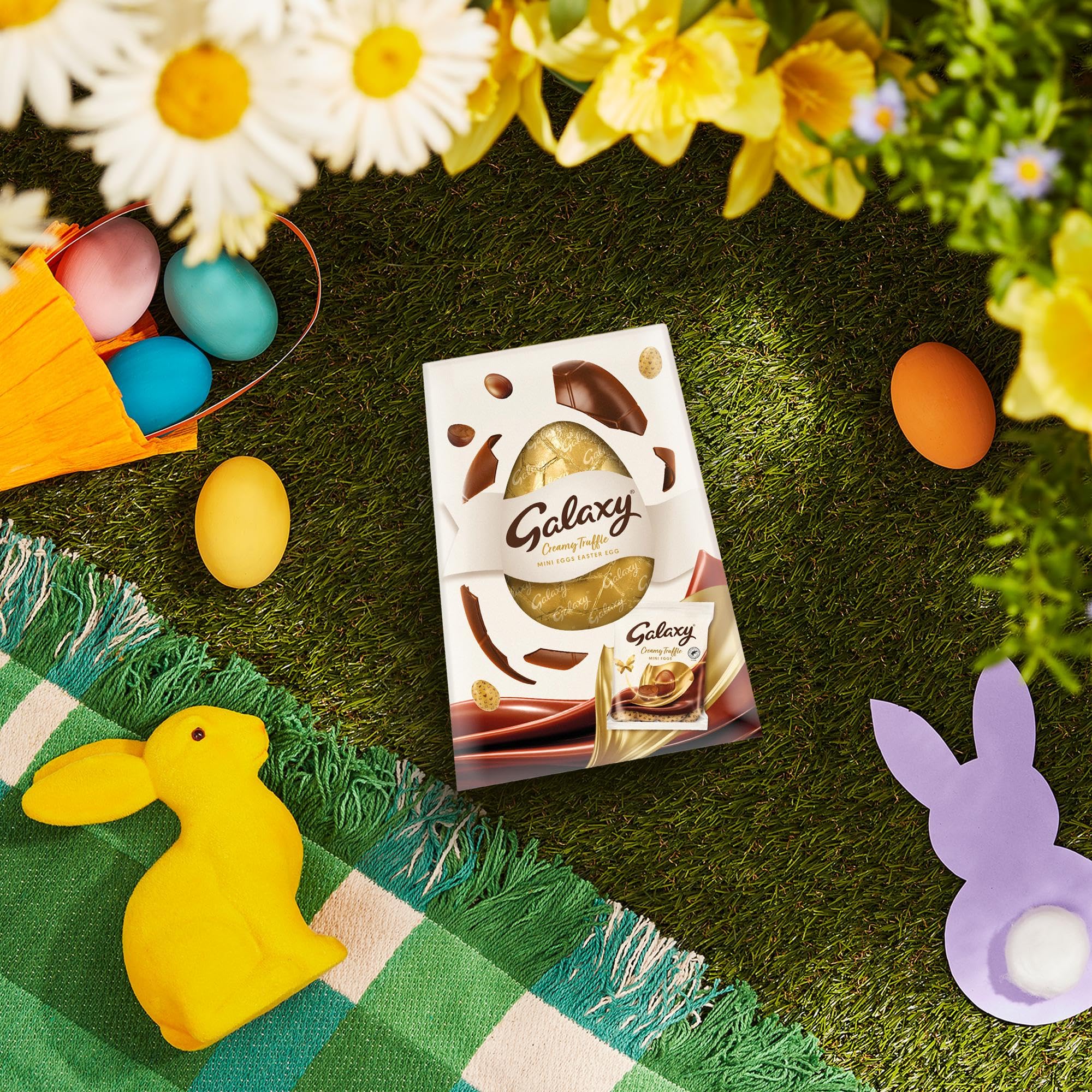 - Galaxy Truffle Delight: Comes with a 74g bag of Galaxy truffle bite-size mini eggs with a creamy chocolate truffle centre, enrobed in indulgently smooth Galaxy milk chocolate.