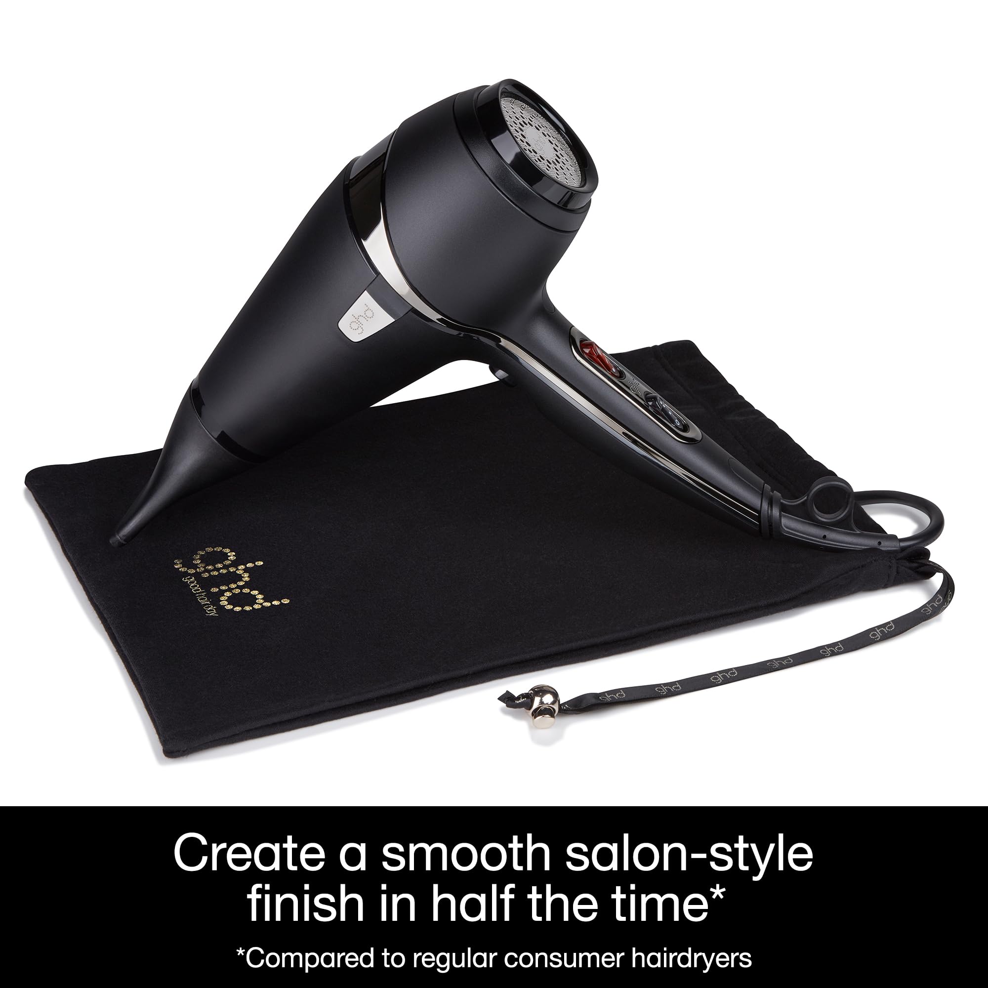 - ghd Air 2.0's powerful 2,100W professional-strength motor and patented removable air filter deliver high-pressure air flow for super-fast drying from root to tip, while advanced ionic technology reduces frizz and flyaways to give a smooth salon-style finish in half the time, compared to regular consumer hairdryers