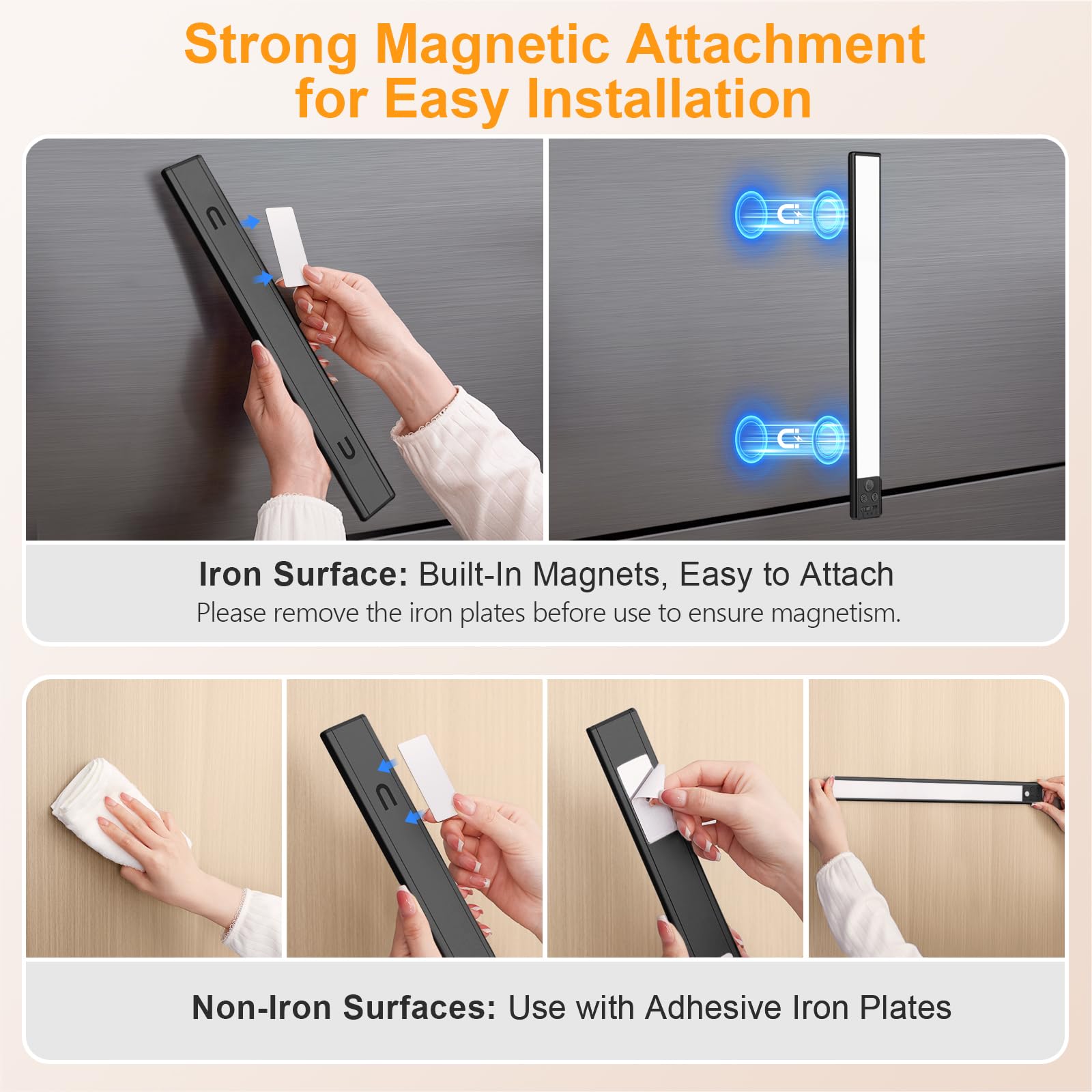 - Ease of Installation & Wide Usage: With built-in strong magnets, these cabinet lights can be easily installed on iron surfaces. For non-metallic surface, you can use the included adhesive iron plates to stick on anywhere you want, which means that it's easy to take off and put back on when it needs a charge. It is a good choice for various occasions including kitchen, bedroom, closet, cabinets, counter, pantry, basement, stair, hallway, shelves, etc.