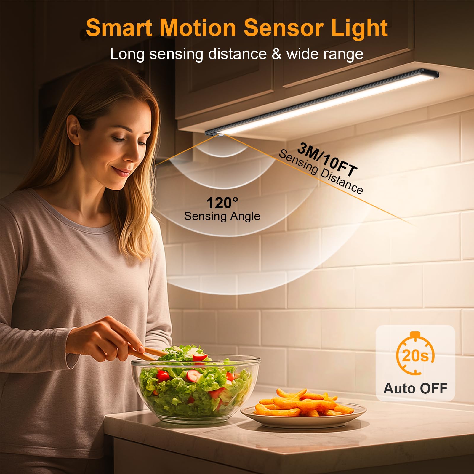 - Upgraded Premium Functionality: Built-in 128 super bright LEDs, the Gritin under cabinet light is crafted with aluminum alloy and durable ABS plastic for ultimate strength and style. Setting the under cabinet lights on motion sensor mode, it features a 120° wide sensing angle and a 3M/10FT detection distance, automatically turning off after 20 seconds of no motion detected, ensuring you never fumble for switches.