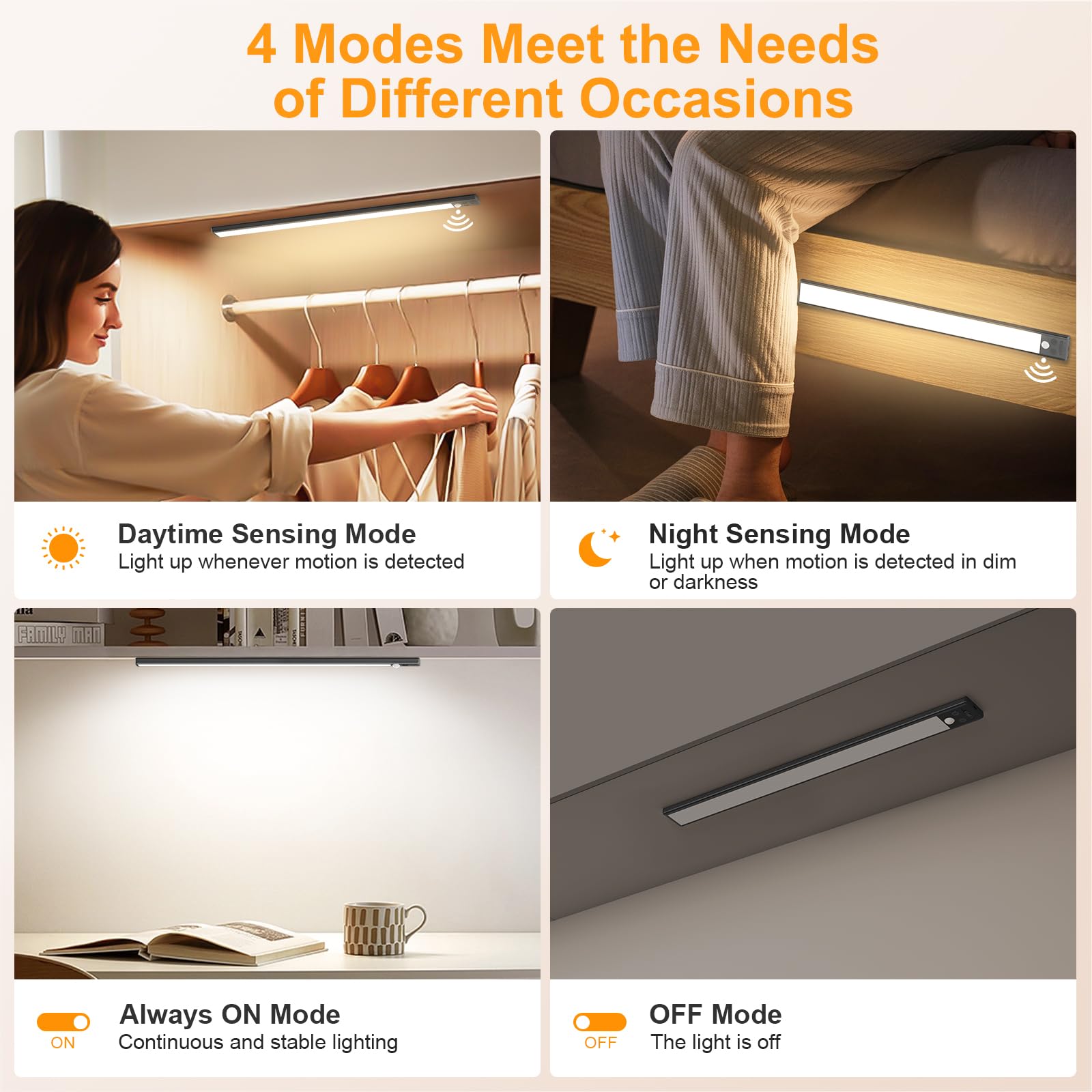 - 4 Lighting Modes: The motion sensor lights support four modes to meet the needs of different occasions: OFF Mode, Night Sensing Mode (motion-activated in darkness), Daytime Sensing Mode (motion-activated at any time whether the environment is dark or not) and Always on Mode (constant light). The auto-sensing functionality ensures energy efficiency, making it ideal for kitchens, closets, cupboards, pantries, stairs, basement and other spaces needing reliable lighting.