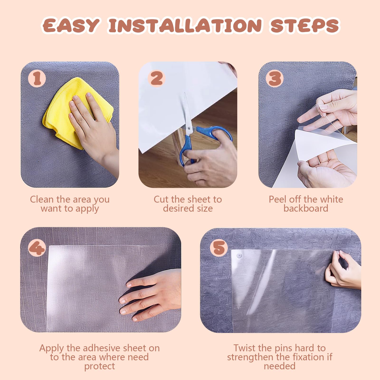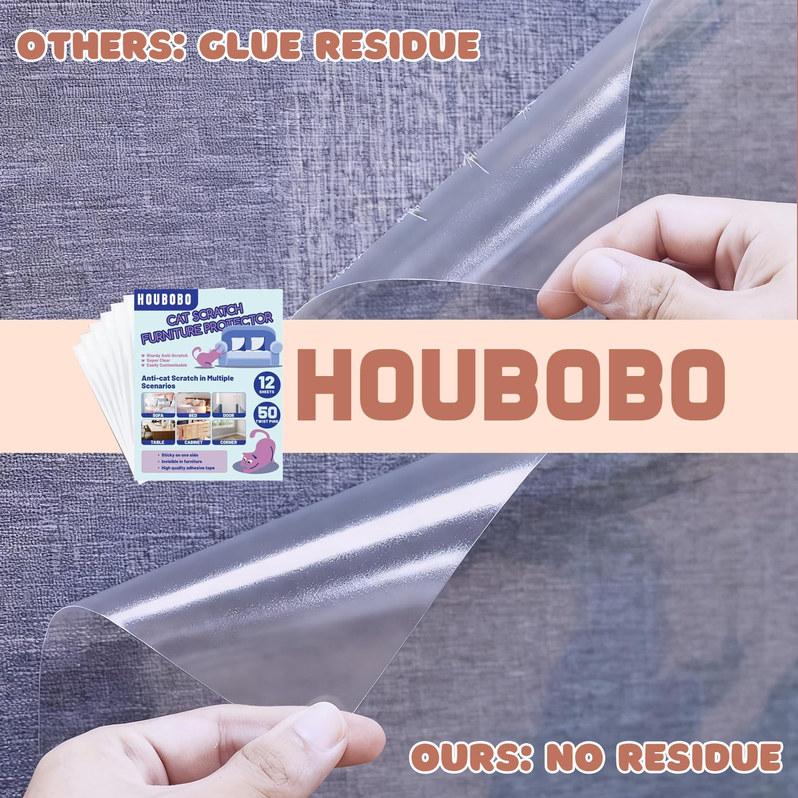 • 【SINGLE-SIDED & TWIST PINS】Houbobo anti-cat scratch furniture protectors feature a single-sided, strong adhesive design that is designed not to damage surfaces upon removal. You can decide whether to use the twist pins but Do Not use on genuine leather, synthetic leather (PU/PVC), velvet, or other delicate fabrics.
