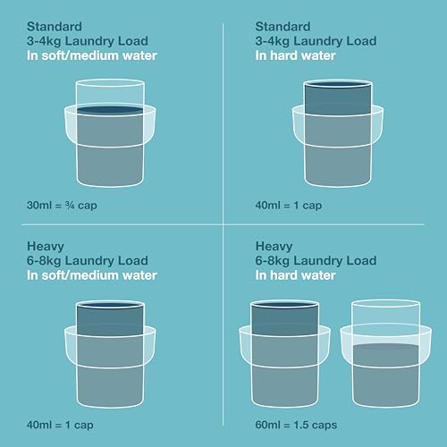 - HOW TO USE: For standard 4-5 kg load, use 30ml of liquid in a soft/medium water area, and 40 ml when washing in hard water. For a heavier wash load, use 40ml of liquid in soft/medium water, and 60ml when washing in hard water.