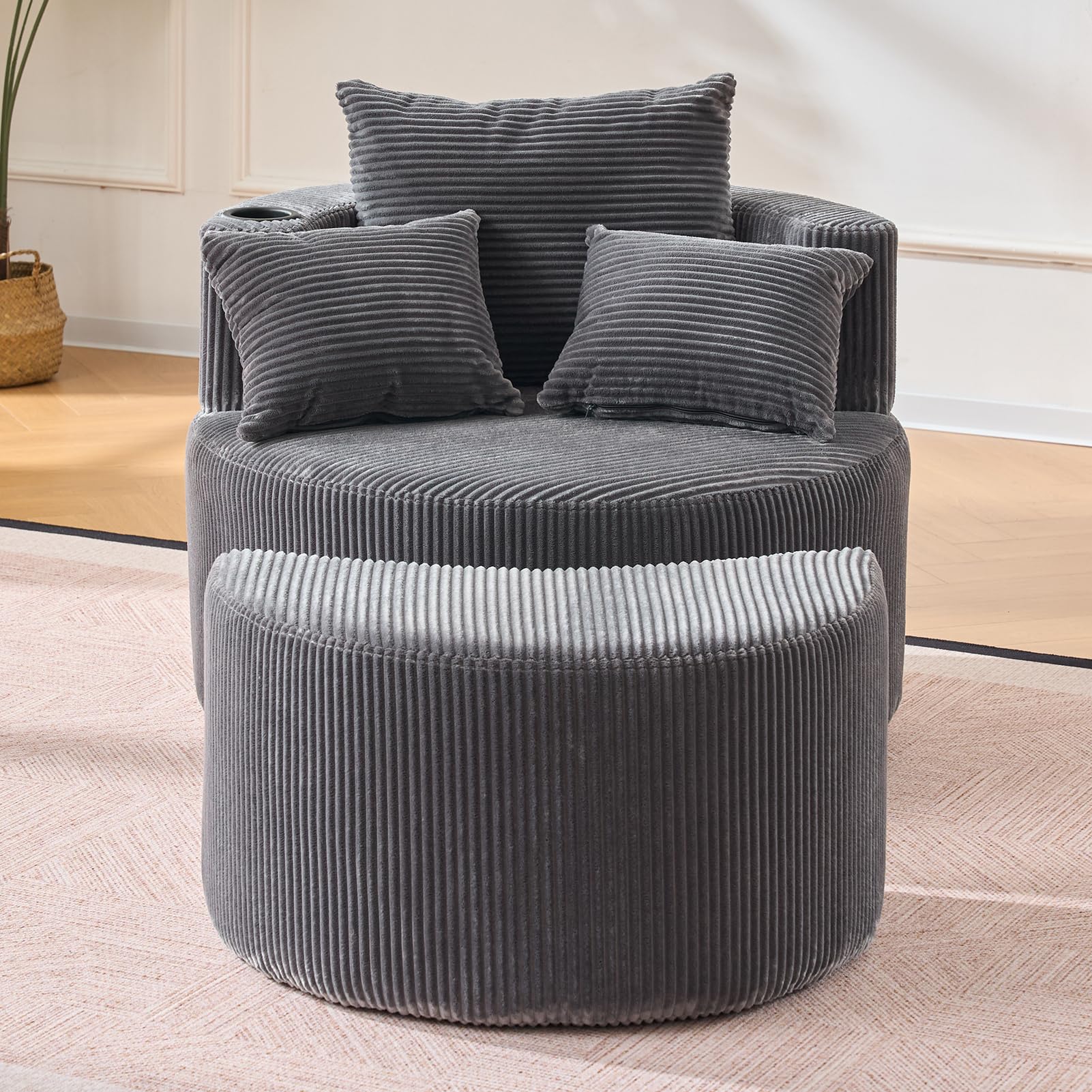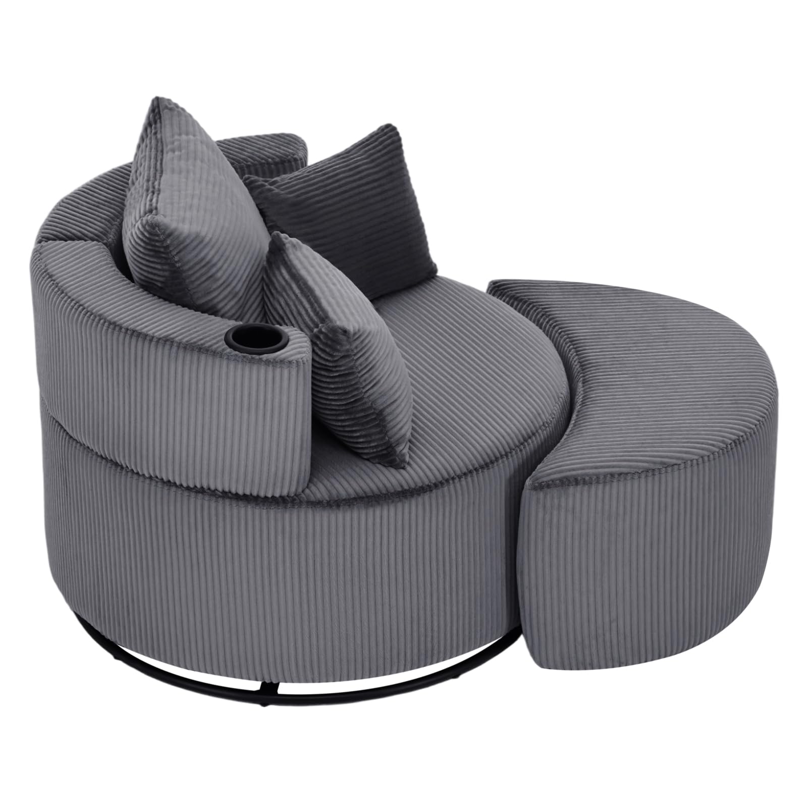 INMOZATA Swivel Snuggle Chair Jumbo Cord Cuddle Chair with Footstool Set Arc 1.5 Seater Accent Chair with Built-in Cup Holder & 3 Pillows Sofa Armchair with 360° Rotating Metal Base, Grey