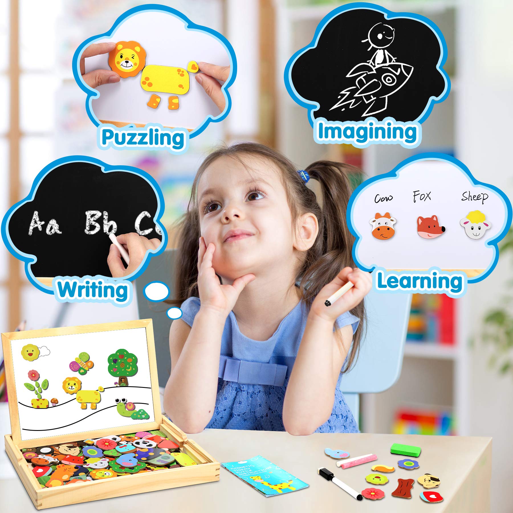 - 【wooden magnetic puzzle】Our wooden magnetic puzzle includes 110 puzzle pieces, 2 pieces of chalk, 1 colored pencil, 1 eraser and 1 puzzle instruction sheet. All parts are packed in a wooden box, which is portable and easy to store.It can be combined into 14 animals with different expressions, colorful trees and flowers, etc.