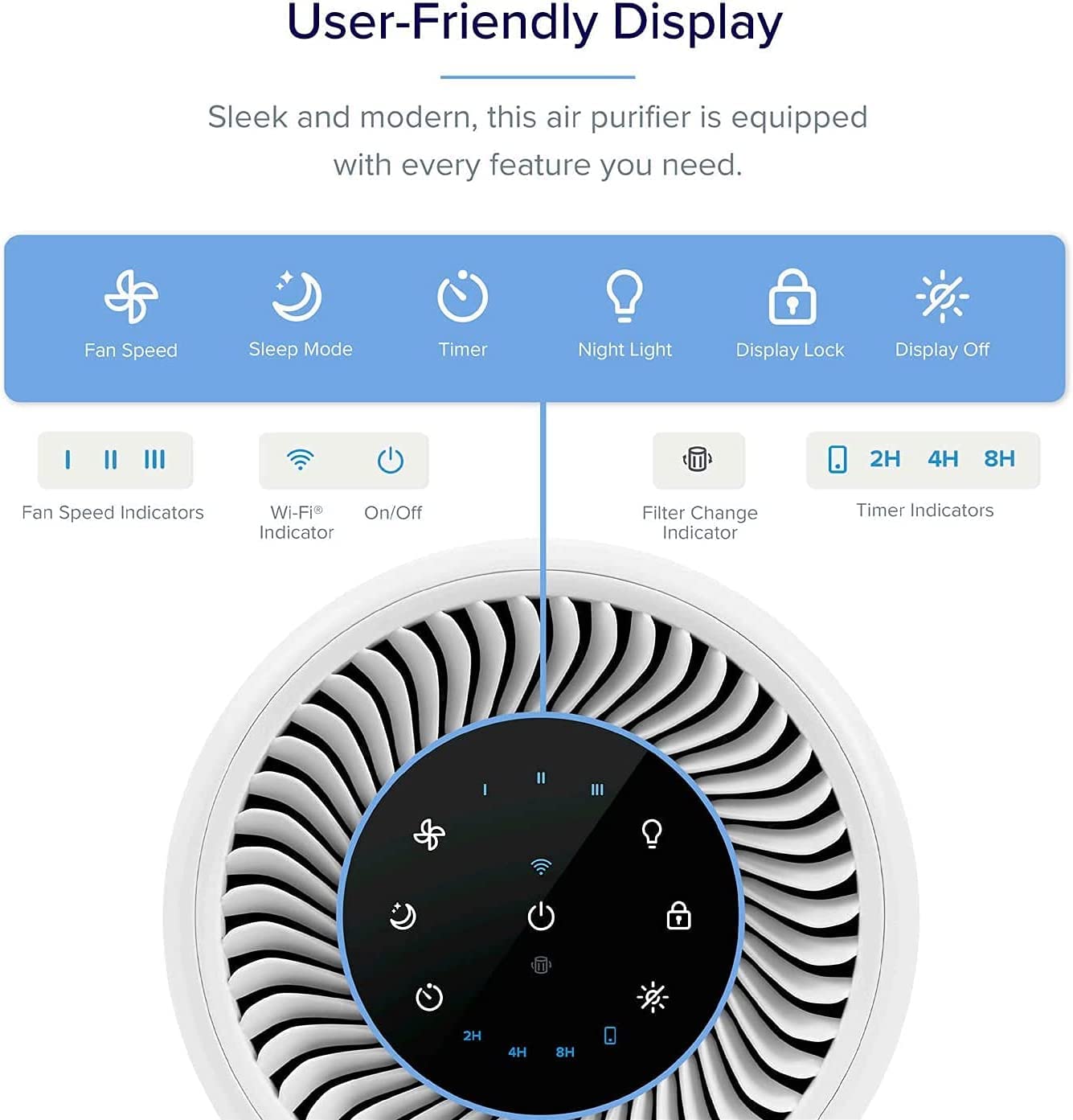 - 【𝐕𝐞𝐫𝐲 𝐄𝐚𝐬𝐲 𝐓𝐨𝐮𝐜𝐡 𝐃𝐢𝐬𝐩𝐥𝐚𝐲】 -- With the touch display you can select 4 speed levels (sleep mode and 1-3 fan levels), set a timer for 2-4-8 hours, switch the night light and display on / off, check filter status