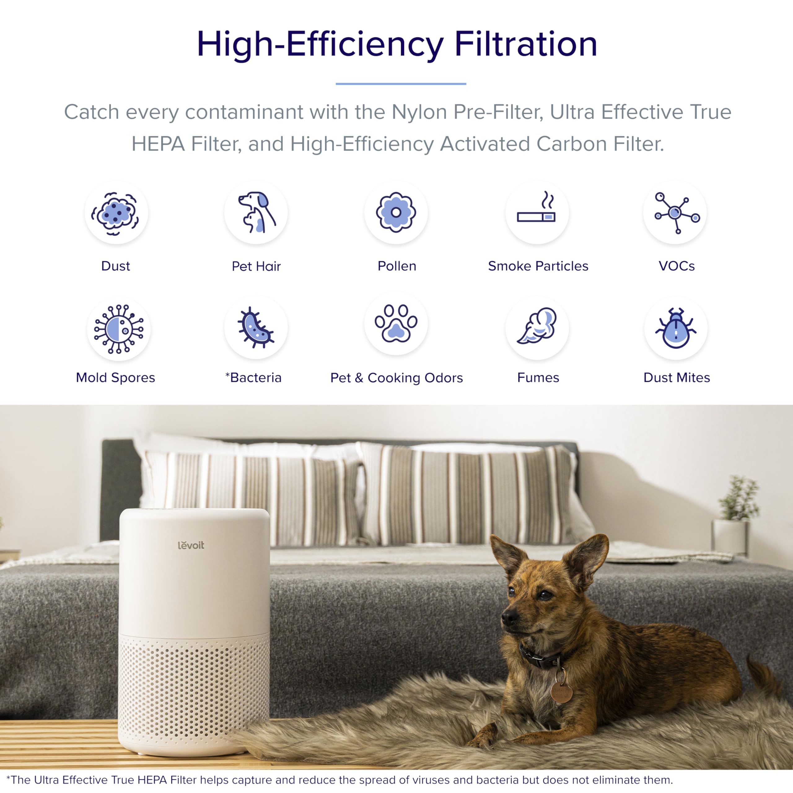 - 【𝐈𝐦𝐩𝐫𝐨𝐯𝐞𝐝 𝟑-𝐒𝐭𝐚𝐠𝐞 𝐅𝐢𝐥𝐭𝐞𝐫 𝐒𝐲𝐬𝐭𝐞𝐦】 -- While the ultra-fine Nylon Pre-Filter and High-Efficiency Activated Carbon Filter capture large particles and absorb odours and fumes, the HEPA Filter captures 99.97% of airborne contaminants 0.3 microns in size, so you are safe from PM2.5, pollen, dust, pet dander and other pollutants