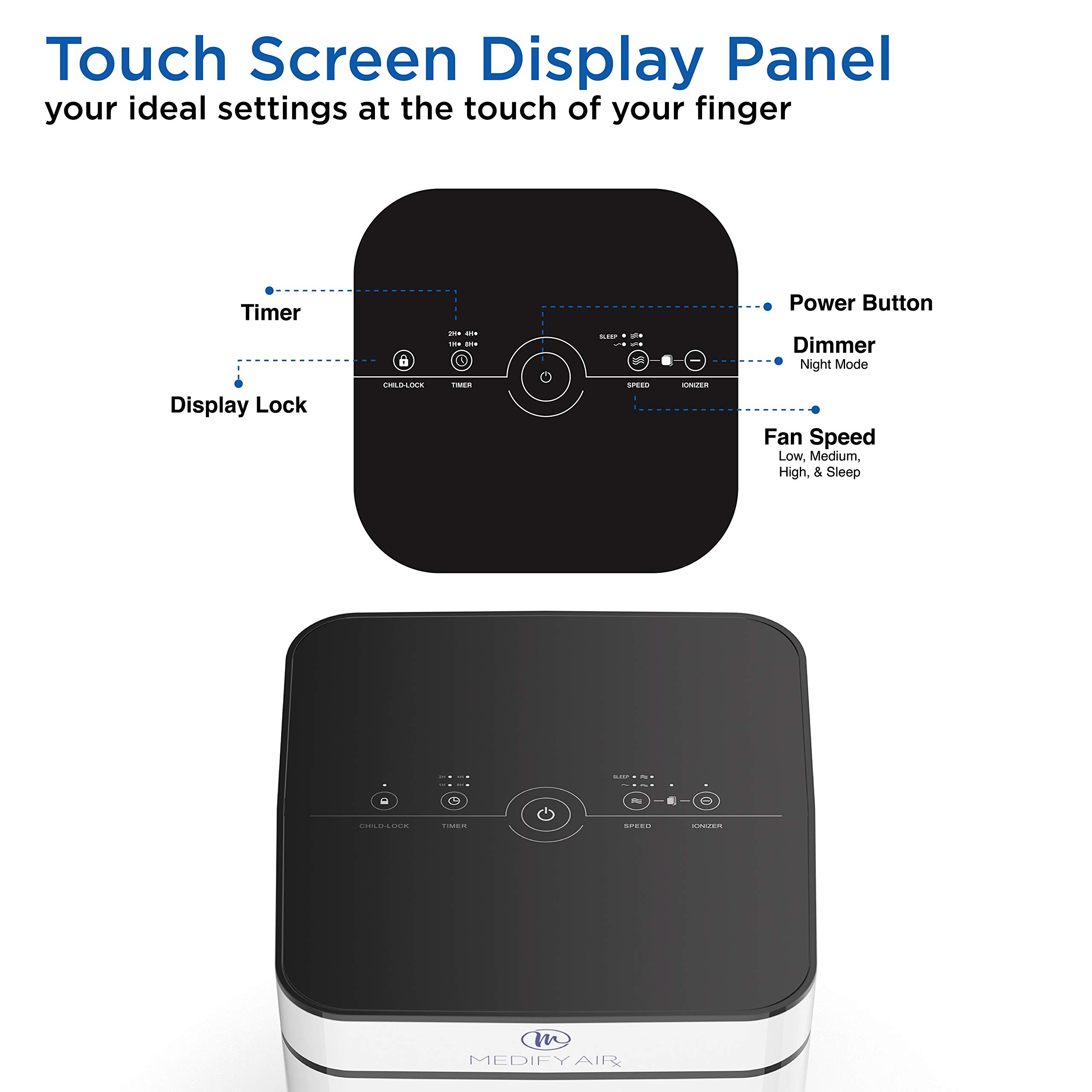 - EASY TO USE FEATURES: Includes a sleek touch screen operation panel with 0-8 hour timer, fan speed, sleep mode, filter replacement indicator, and child lock, great for both kids and pets.