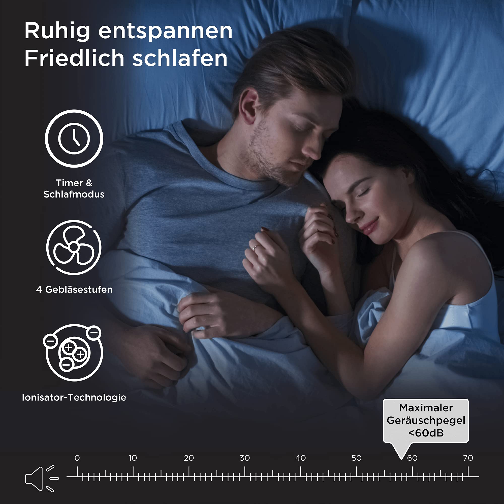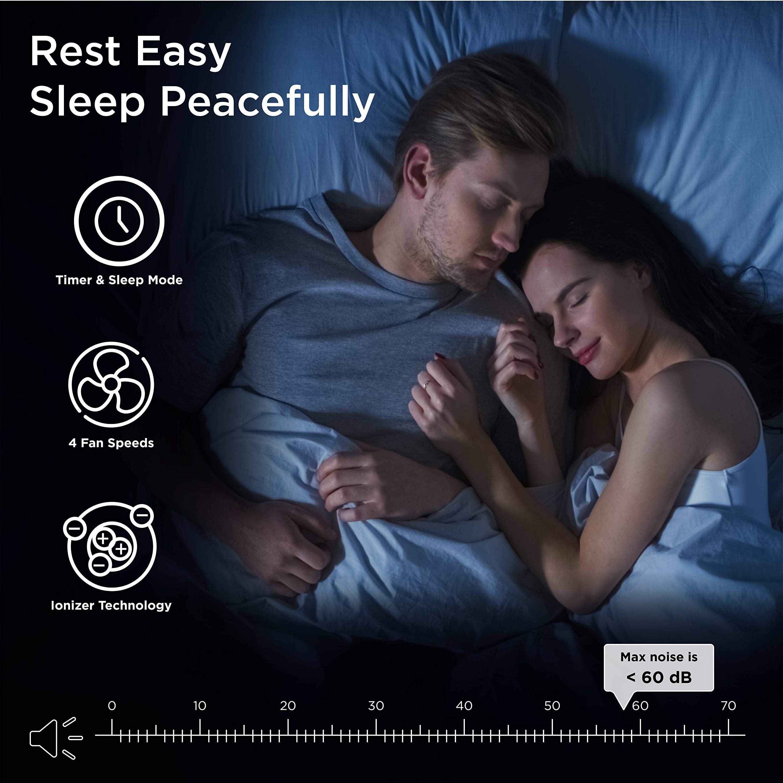 - ULTRA QUIET: Choose from 3 fan speeds, with the lowest setting operating virtually silent. Runs at 220 Volts at a min noise level of 46dB and max of 66dB. For the most discreet operation, enable sleep mode to completely dim the unit's panel lights.