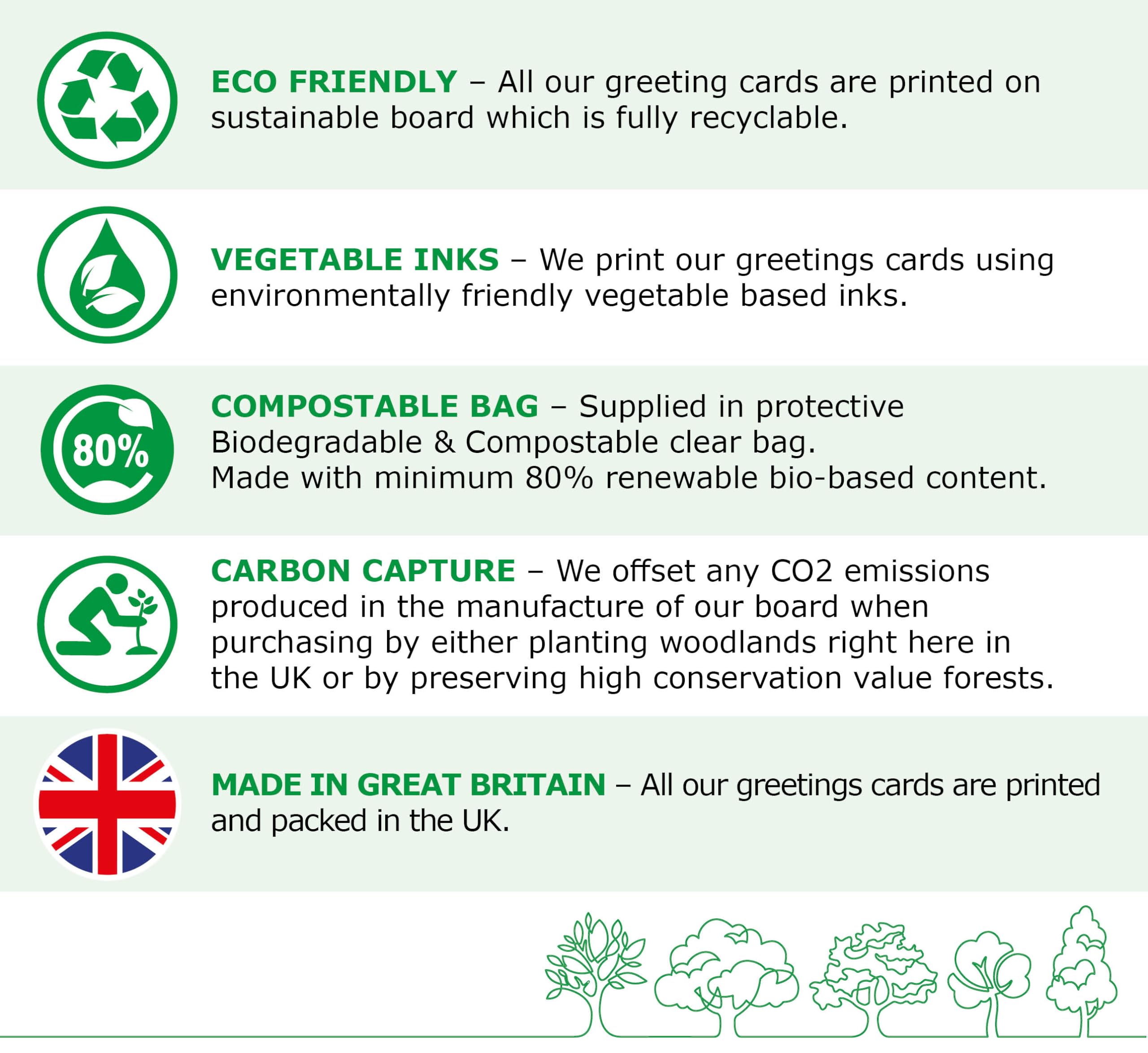 - ECO FRIENDLY PRODUCTS - We only use card and envelopes which are fully recyclable. We carbon balance by planting trees through the Woodland Trust here in the UK.