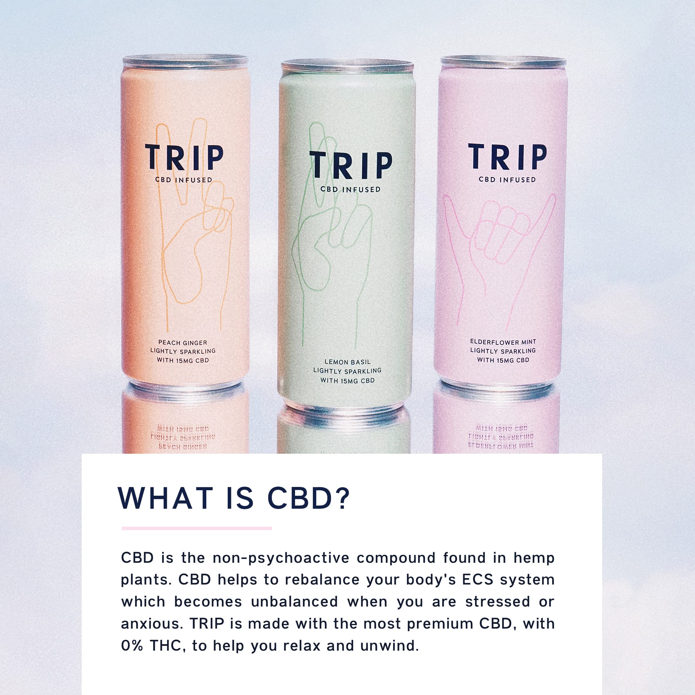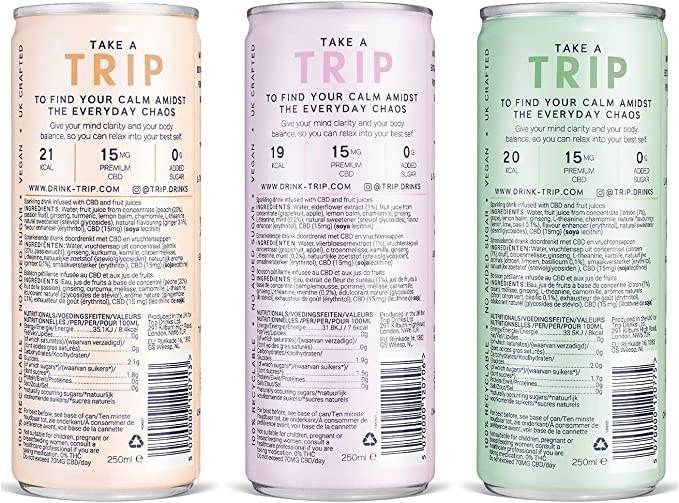- Meet our MIXED PACK ft. ELDERFLOWER MINT, PEACH GINGER & LEMON BASIL. The whole gang’s gluten-free, vegan with no added sugar - made in the UK in 100% recyclable cans. Buy for yourself, send to a friend, throw a party - TRIP’s here for you. Deliciously refreshing, lightly sparkling and infused with natural adaptogens for stress-free sipping. Drink chilled from the can or mix into cocktails (Gin TRIP anyone?).