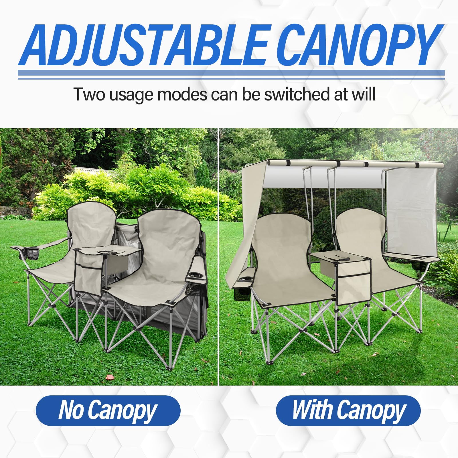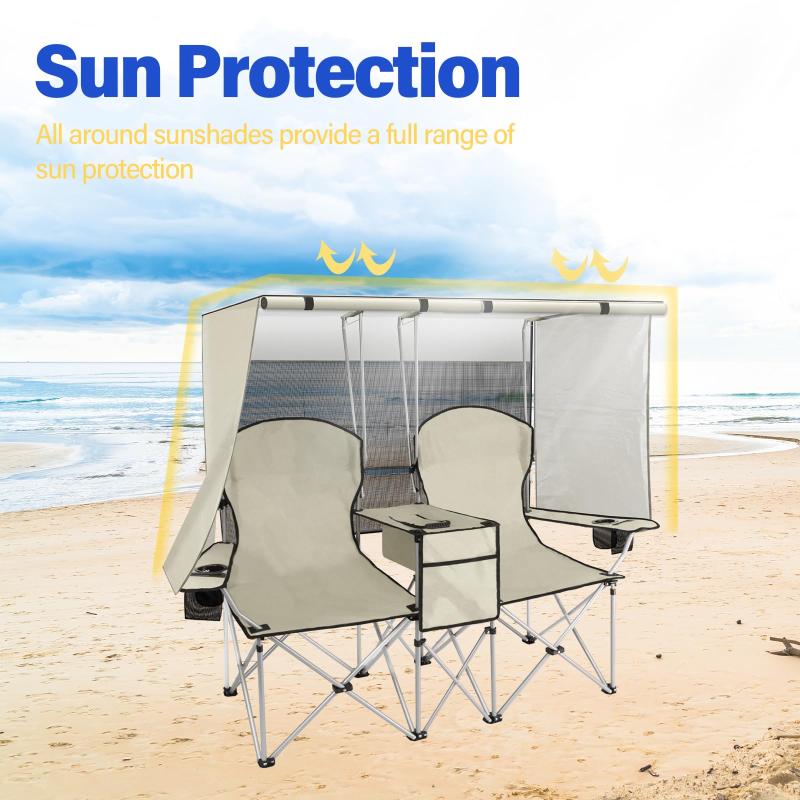 PLKO Portable Double Camping Chair with Canopy Shade,Heavy Duty Beach Chairs for Adults,Folding Beach Chair with Cooler Bag for Sports Backyard Fishing Outside(White)