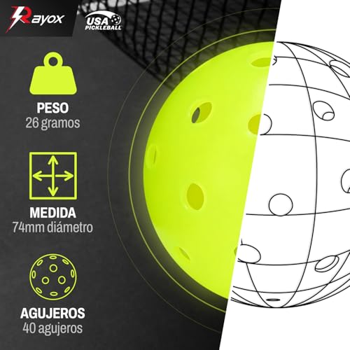 - DESIGNED FOR OPTIMAL PERFORMANCE: Rayox pickleballs are manufactured to the highest standards, ensuring quality play on any surface. Weighing 0.9 oz (25 g) and a diameter of 2.9 inches (7.4 cm), our 40-hole balls offer a perfect balance between durability and accuracy, ensuring superior performance on every shot.