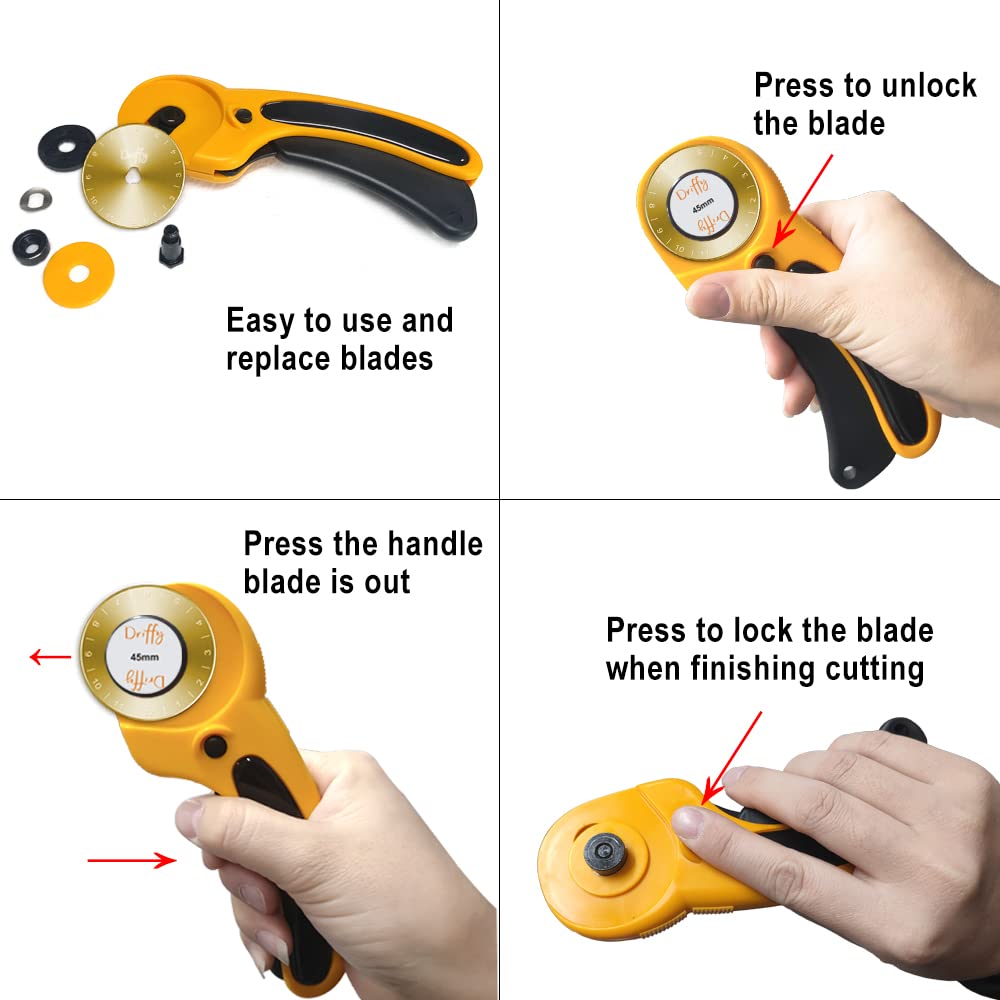 Rotary Cutter with 4 Extra 45mm Blades - for Quilting Fabric