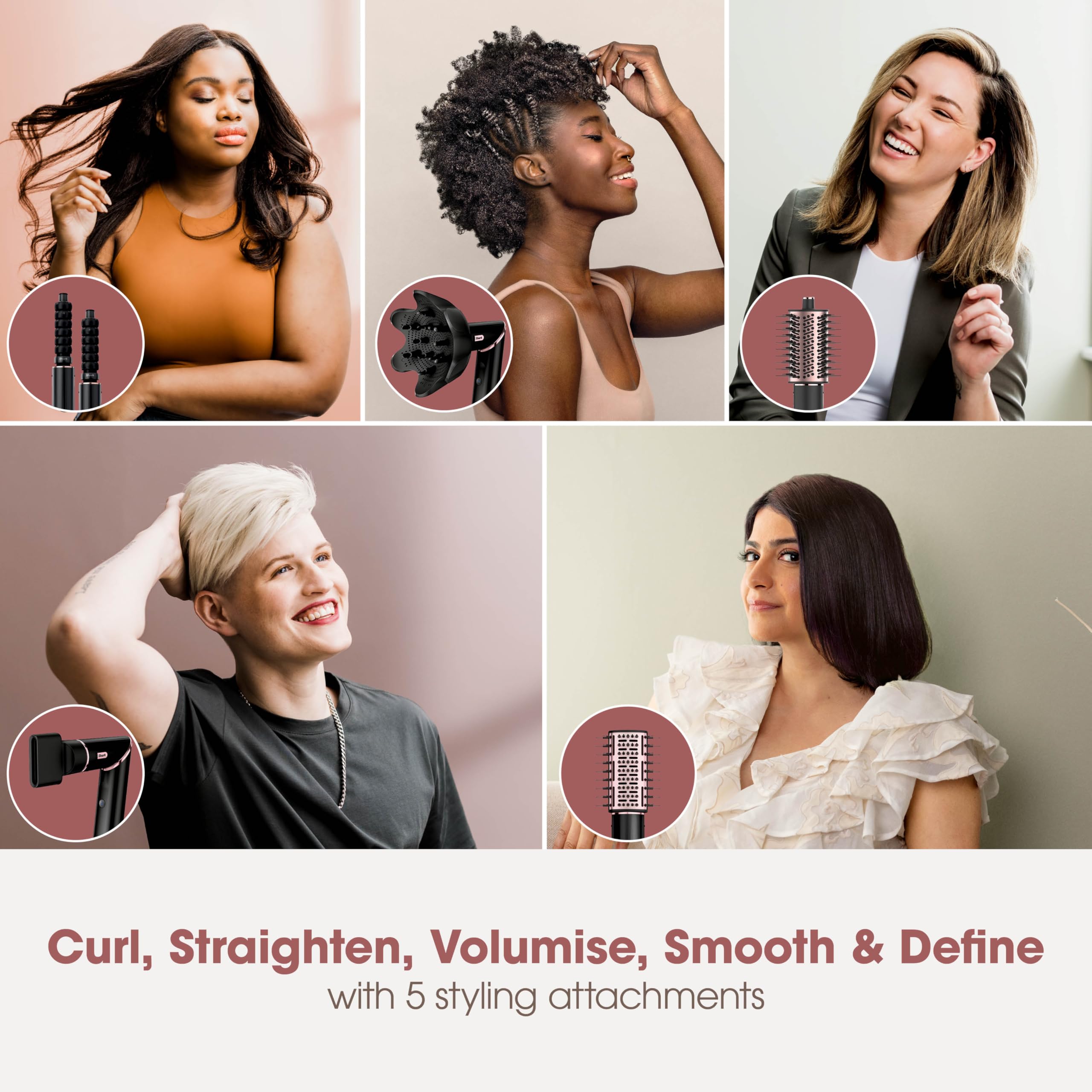 - 5 WAYS TO STYLE: Curl, Straighten, Volumise, Smooth and Define your hair with 5 styling attachments: Auto-Wrap Curlers, Paddle Brush, Oval Brush, Concentrator, Diffuser