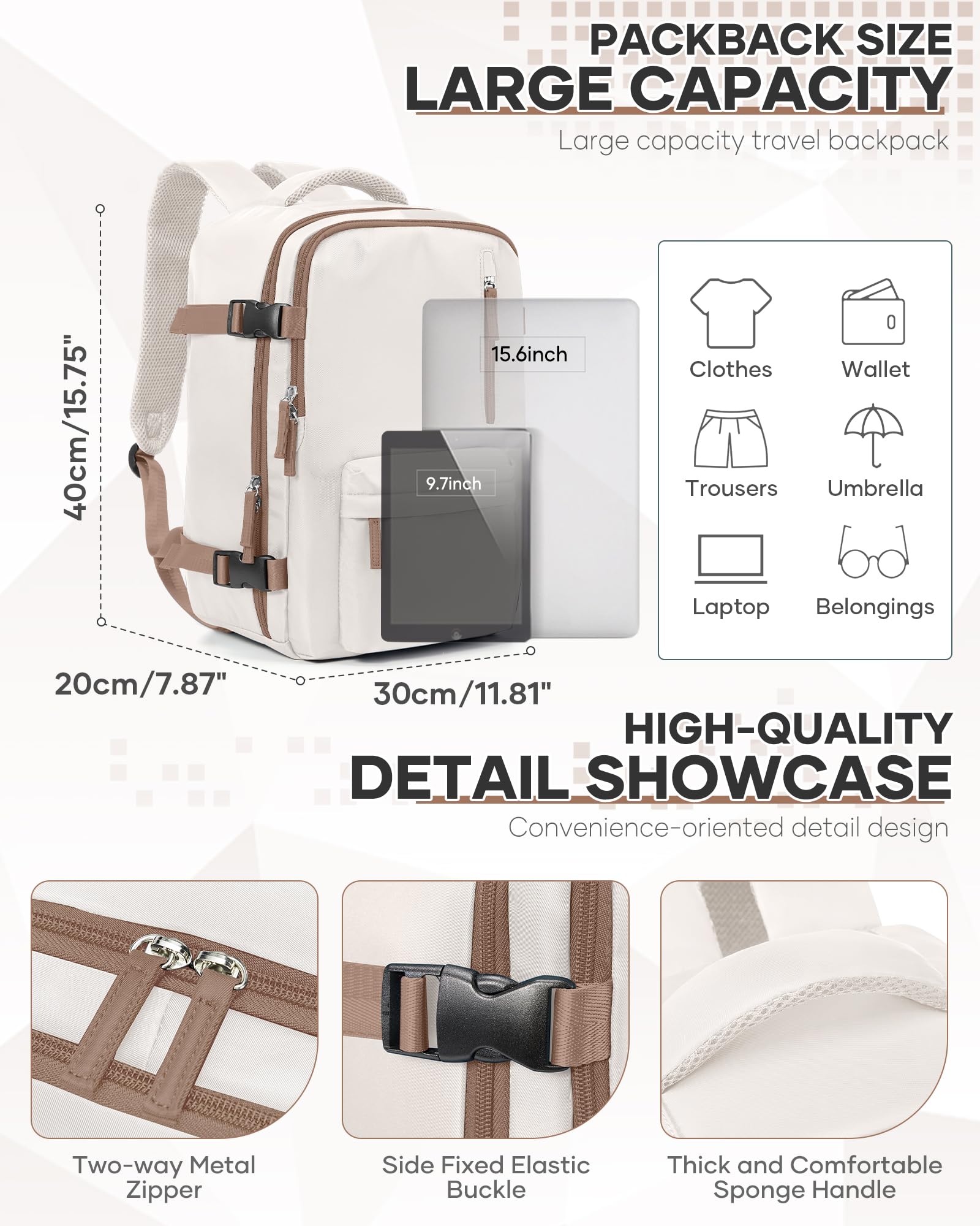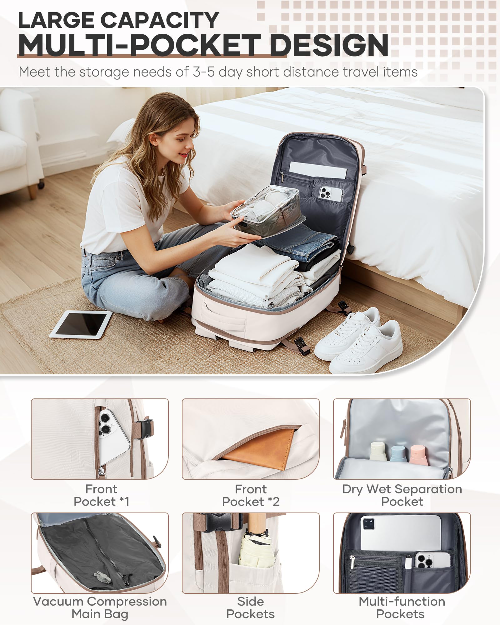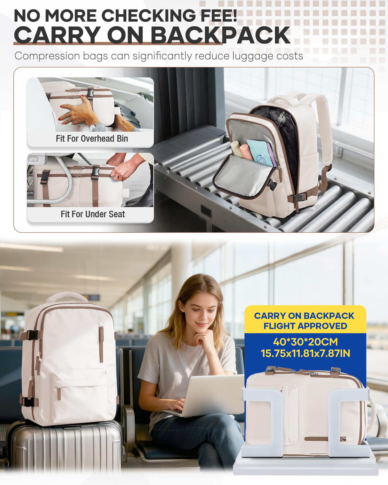 SZSYCN Vacuum Backpack Travel Bag With Pump Ryanair Cabin Bags 40x30x20 Underseat Carry On Baggage with Compression System For Flights Backpack Beige Brown