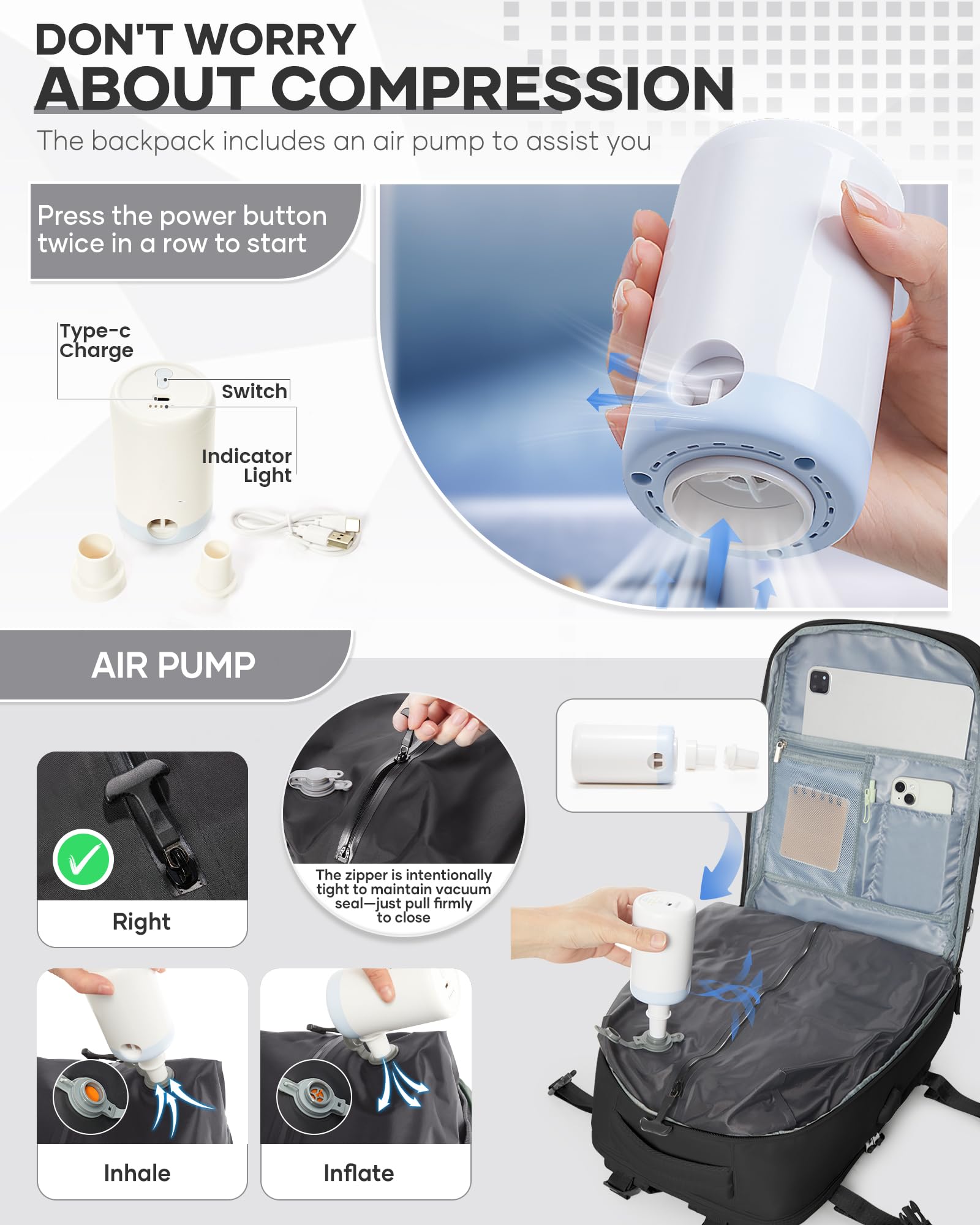 - 【With Vacuum Pump】Each vacuum backpack comes with a special vacuum pump that allows you to effortlessly compress your luggage in just a few minutes. The pump is specially designed to be compatible with the valves of our backpacks and is essential for optimal compression. The pump is provided as a free accessory and must be returned along with the backpack when requesting a refund or exchange.