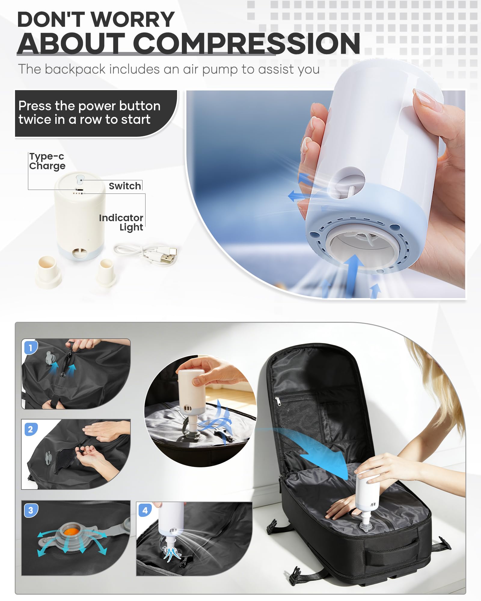 - 【With Vacuum Pump】Each vacuum backpack comes with a special vacuum pump that allows you to effortlessly compress your luggage in just a few minutes. The pump is specially designed to be compatible with the valves of our backpacks and is essential for optimal compression. The pump is provided as a free accessory and must be returned along with the backpack when requesting a refund or exchange.