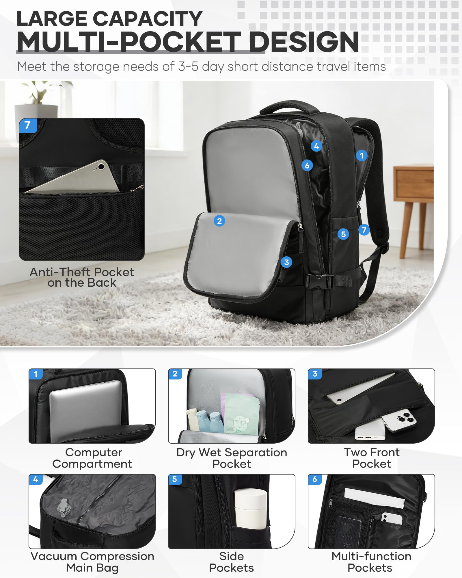 - 【Extremely Strong Compression and Space Saving】Experience our advanced vacuum compression technology with this backpack and enjoy maximum storage efficiency. Simply place your clothes in the bag and remove the air using the included electric pump to see how the items are significantly reduced. This revolutionary process decreases volume and increases your luggage space by over 50%, making it ideal for long-distance travel.