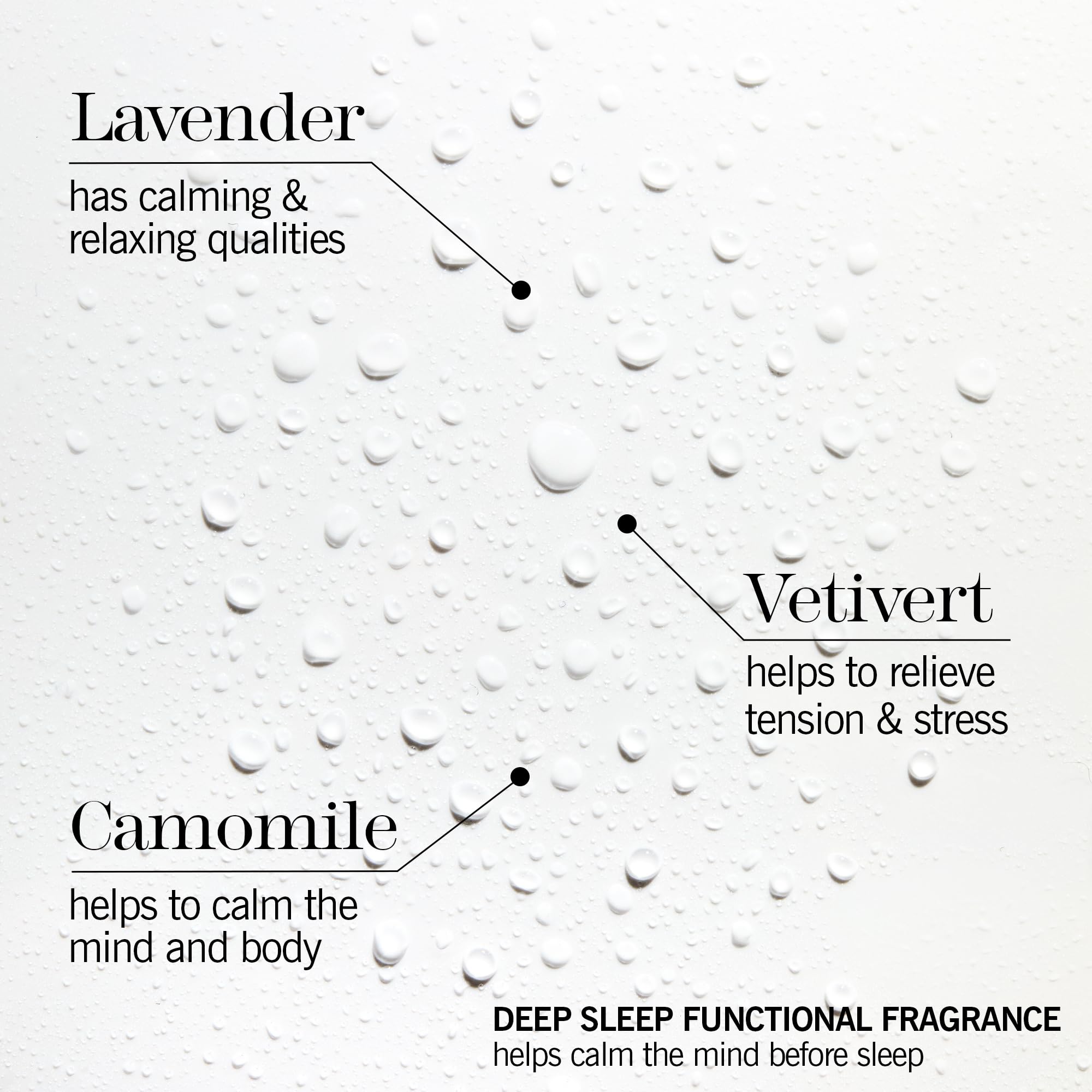 - NATURAL FRAGRANCE - Our deep sleep functional fragrance, with its signature aromatherapeutic Superblend of Lavender, Camomile and Vetivert essential oils helps calm both mind and body*.