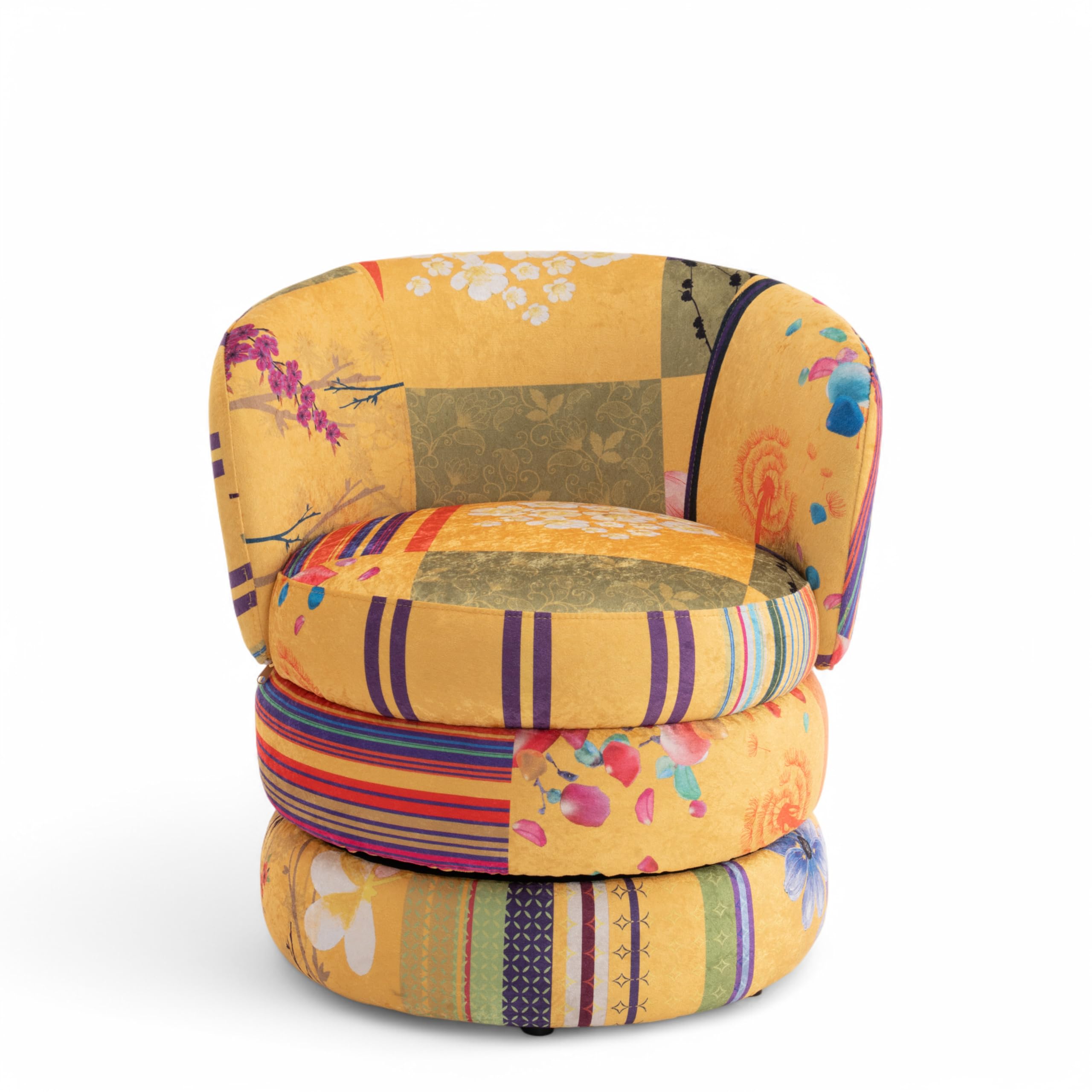 TILLY Patchwork Swivel Cuddle Chair – Colourful Velvet Armchair and Snuggle Seat, Ideal Swivel Accent Piece or Cuddle Chair for Bedroom and Living Room, Perfect Patchwork Design for Modern Interiors