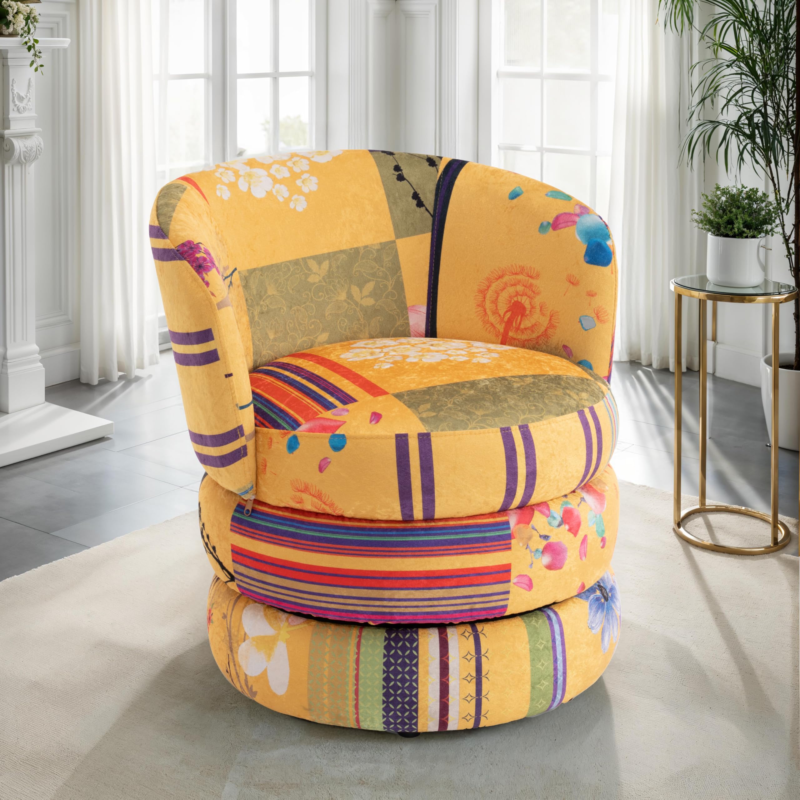 - Vibrant Patchwork Swivel Chair: Bring colour and creativity into your space with this stunning patchwork chair. Its multi-coloured upholstery makes it one of the most eye-catching patchwork chairs for living room settings — perfect for eclectic, artistic, or modern interiors that crave a playful twist.